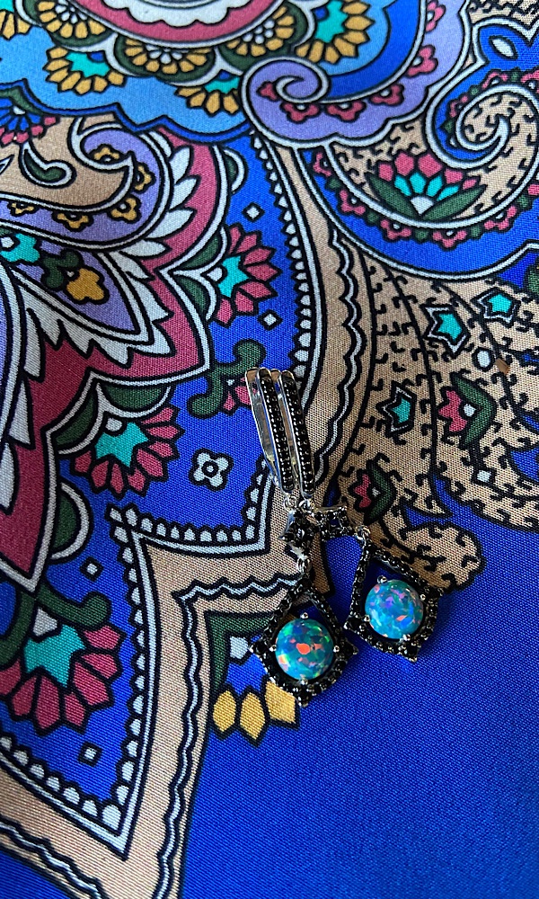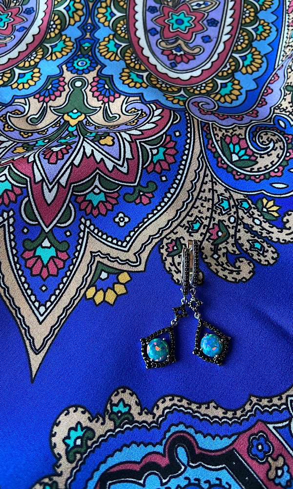 Восточная сказка вид 13 , шёлк, 130х130, Дадонова Ирина и серьги «Соколов» серебро с опалом(синт.) По-моему хороший дуэт?