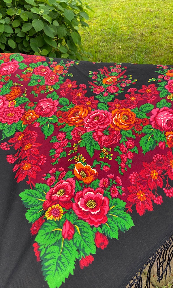 Я показывала здесь свой платок 25 мая, в этой теме, чёрный. А этот такой же, но красный, не мой, за качество фото не отвечаю. )