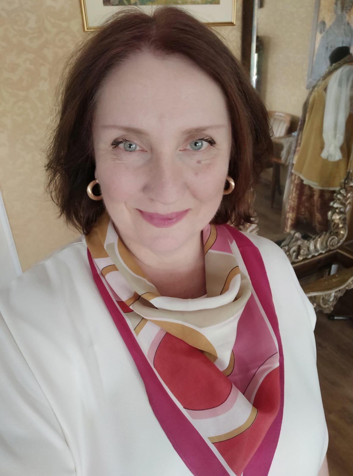 Хочется про классный образ ваш сказать в этом платке-малышке. Как его круги золотые перекликаются с золотом серёжек, как розовые цвета хорошо сочетаются с помадой! И как здорово это всё на светлом! И контраст динамичного спортивного и женственного, нежного, утончённого! (Кликните, чтобы почитать, что спрятано под катом)...