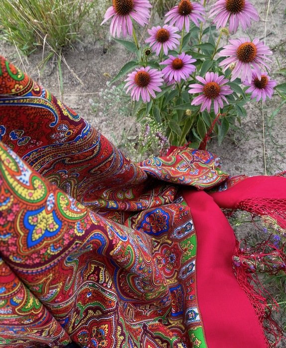 Очень рада, что у меня теперь есть эта шаль. Нарядная и повседневная одновременно. Очень правильный красный (для меня) по кайме--холодноватый. Рисунок в тему "Терема".