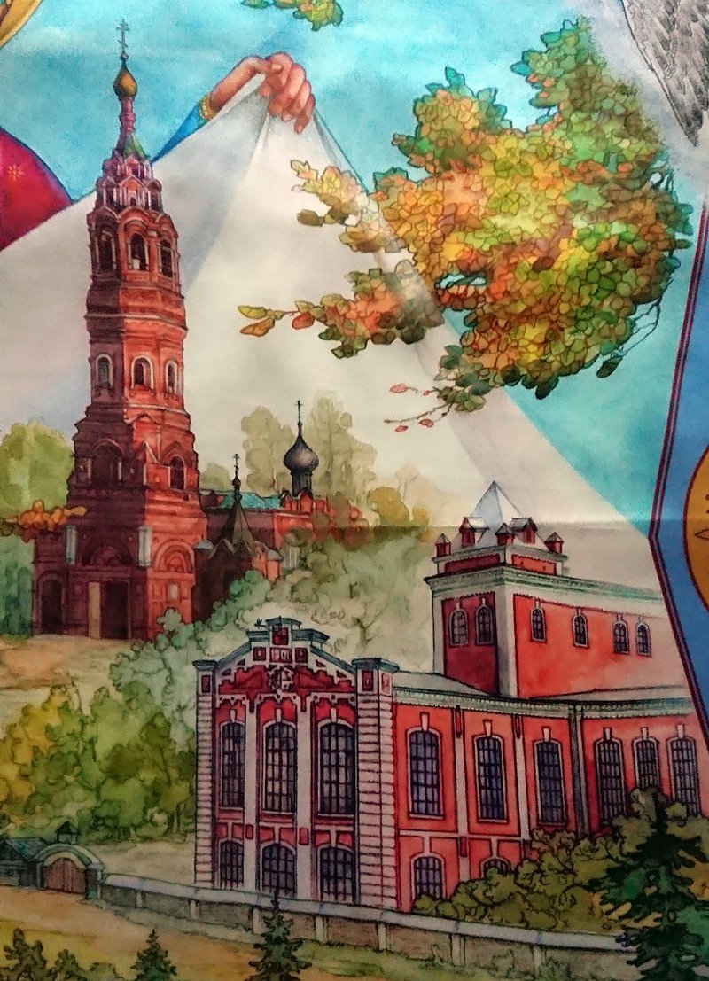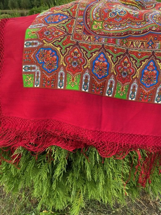 Очень рада, что у меня теперь есть эта шаль. Нарядная и повседневная одновременно. Очень правильный красный (для меня) по кайме--холодноватый. Рисунок в тему "Терема".