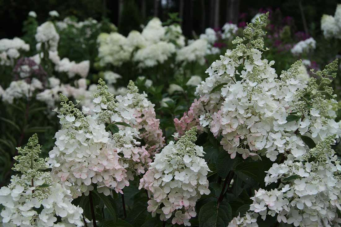 Но самые любимые метельчатые гортензии. Минимальные по уходу и максимальные по эффекту на участке, причем за счет смены цвета с белого на оттенки красного вид участка меняется. Сейчас почти все еще белые, только немного начали розоветь.