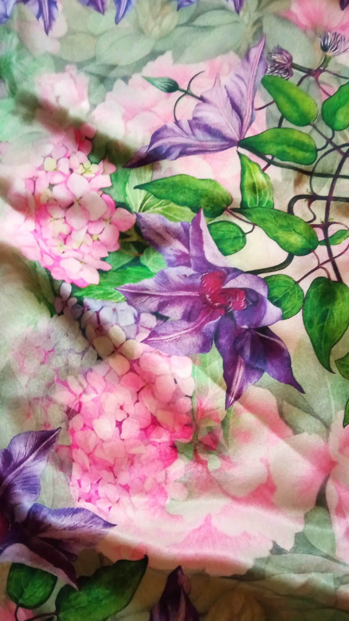 Я тоже получила свою Цветочную сказку! Подтверждаю - розы ГОРЯТ!!!! Как мы и хотели. Помниться, наши колористы говорили, что трудно достичь этого цвета и этого эффекта. Так вот - получилось! Спасибо! Платок очень красивый!