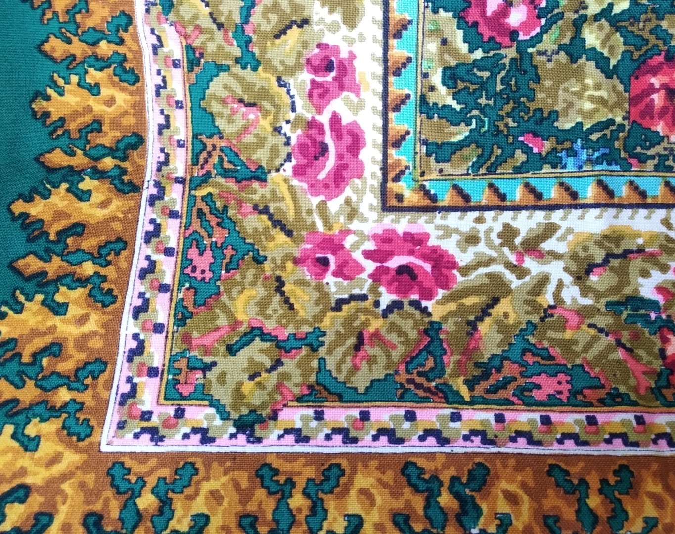 Шаль эффектная - роскошные цветы и выразительная сложная цветовая гамма рисунка. Попыталась с фотографировать, хотя цвет несколько засвечен, но так как шаль редкая выложу для сравнения.