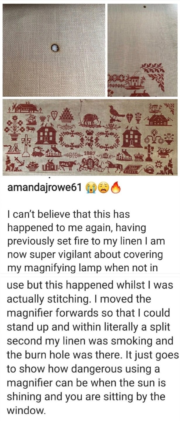 И, конечно, вышивая надо следить. Вот, вышивальщица пишет, что прямо в процессе работы прожгло дырочку в полотне из-за фокусировки солнечных лучей.