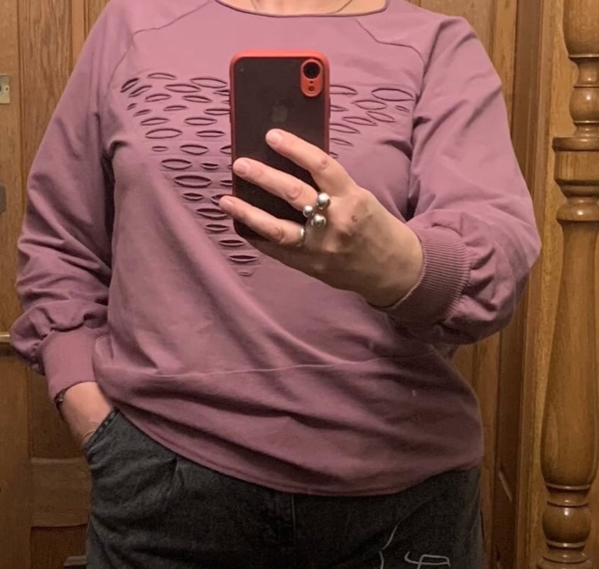 Какие наши девушки рукодельницы!Захожу,любуюсь,вдохновляюсь... Надо как-то отвлекаться.Пока шью.В основном трикотаж.Очень понравилась дырявая отделка,не обработанные края горловины,и сочетание лица и изнанки футера с лайкрой(у неё красивый бархатистый эффект).Фото делала для отзывов на джинсы,поэтому урезала