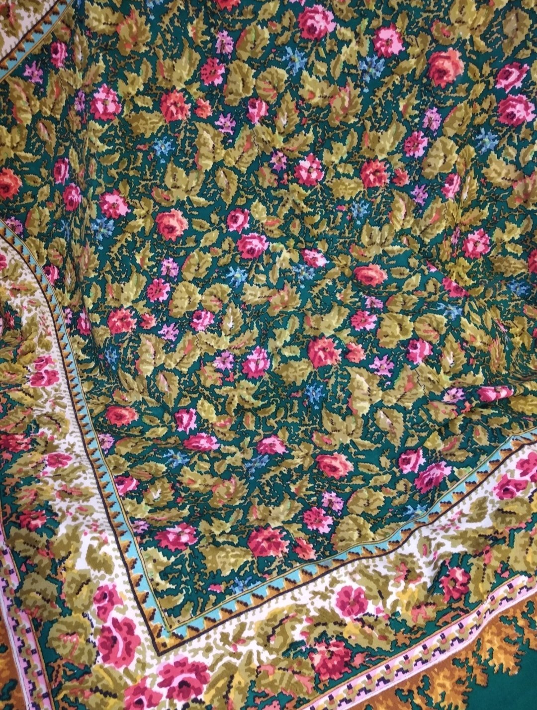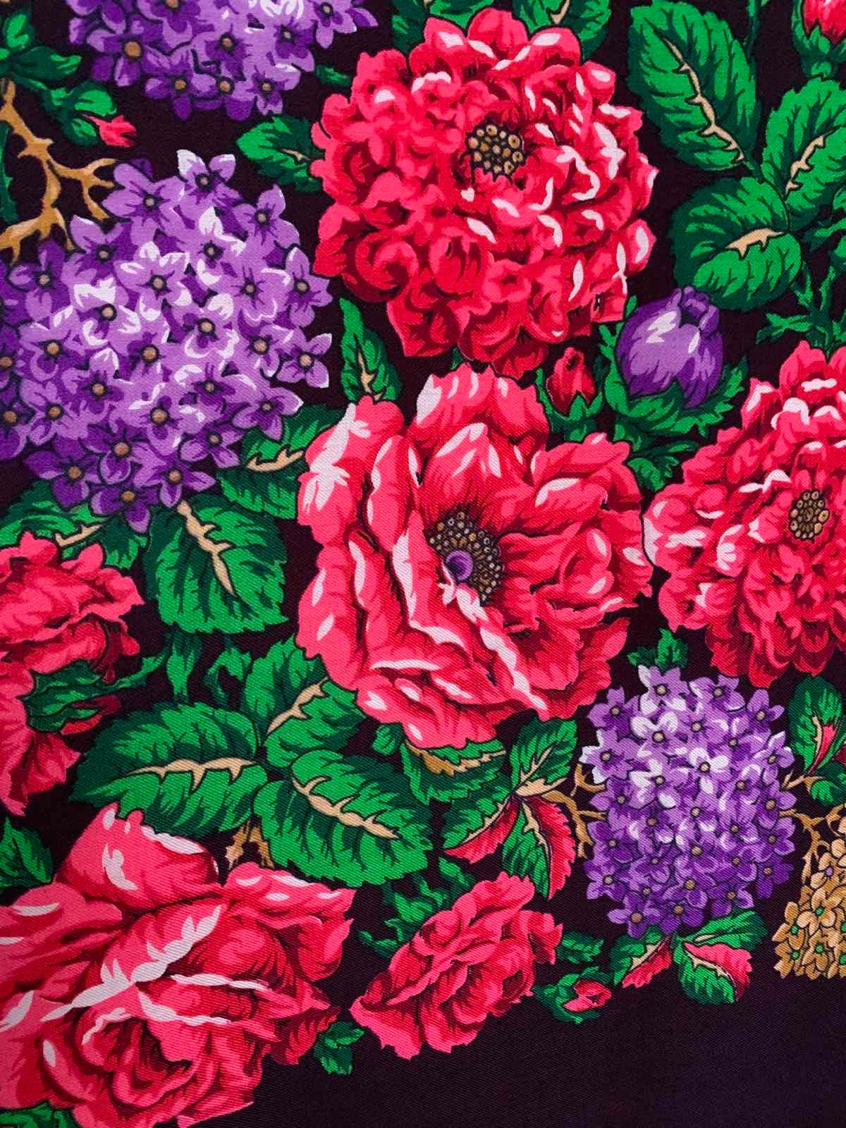 Шаль эффектная - роскошные цветы и выразительная сложная цветовая гамма рисунка. Попыталась с фотографировать, хотя цвет несколько засвечен, но так как шаль редкая выложу для сравнения.