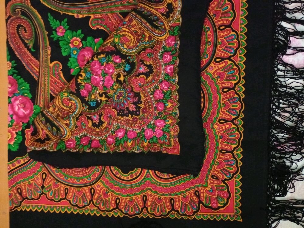 Шаль эффектная - роскошные цветы и выразительная сложная цветовая гамма рисунка. Попыталась с фотографировать, хотя цвет несколько засвечен, но так как шаль редкая выложу для сравнения.