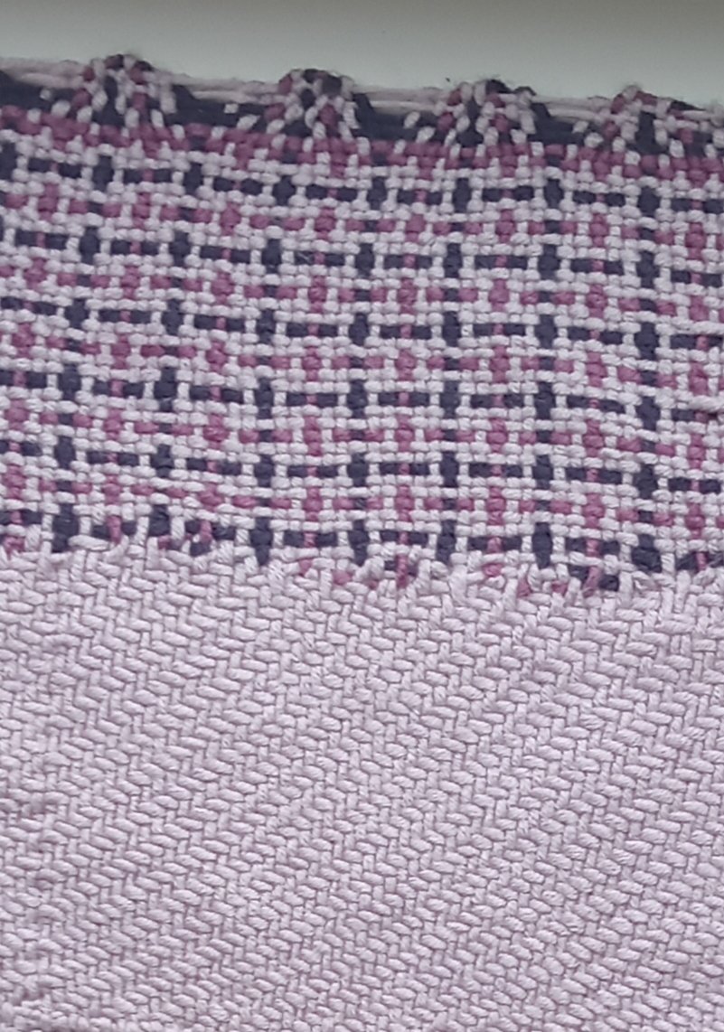 А это ошибочный вариант. Придумала сложный узор, с меняющимся переплетением (сатиновое и полотняное), запуталась, шов получился виден и т.п. Ширина одной половины (т.е.ткань из толстых ниток на всю ширину берда) получилась 33см. Т.е.готовое изделие получается Уже берда, в любом случае.
