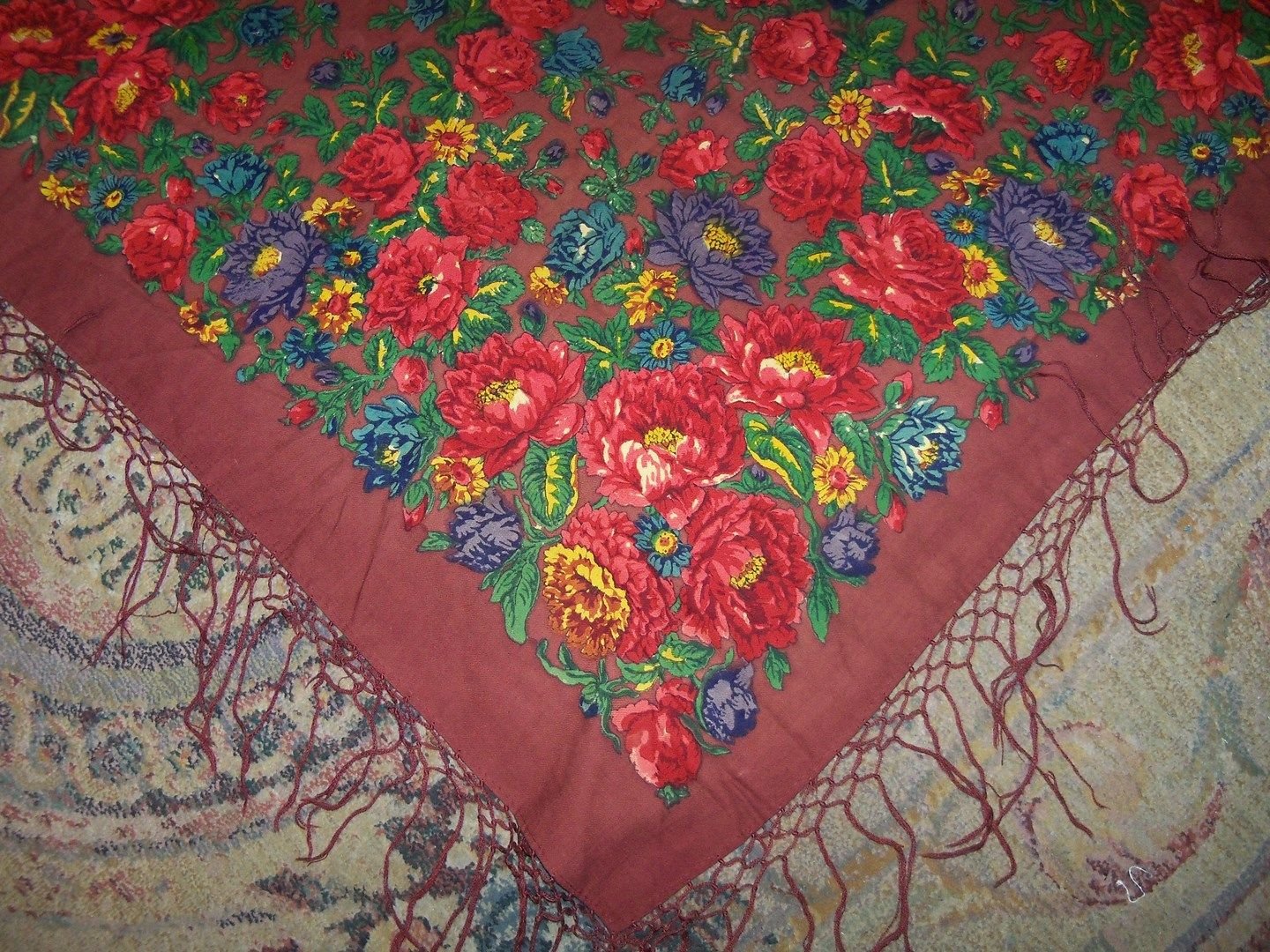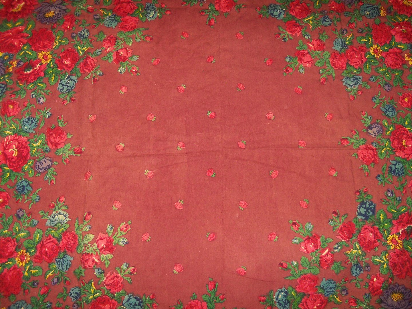 Вот еще из давно сохраненных фото. Думала, что этот платок есть в нашем архиве, но не нашла. Явно довоенная шаль ручной набойки, но точно не знаю.