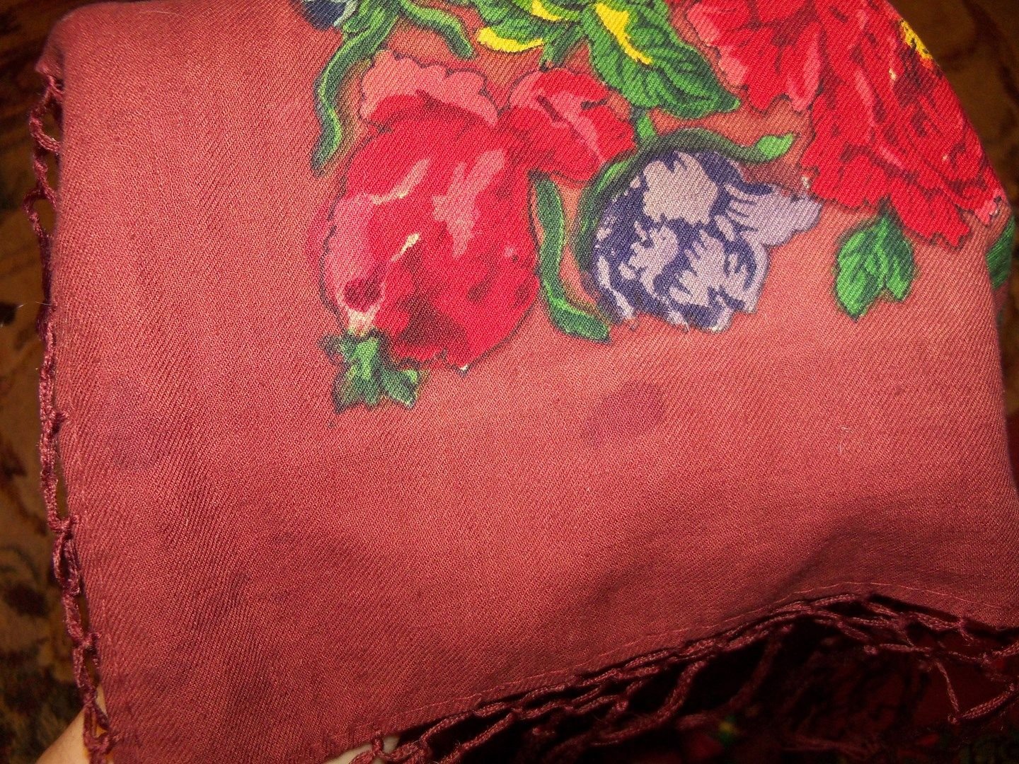 Есть пятна от времени, вблизи видны по всей светлой части платка.