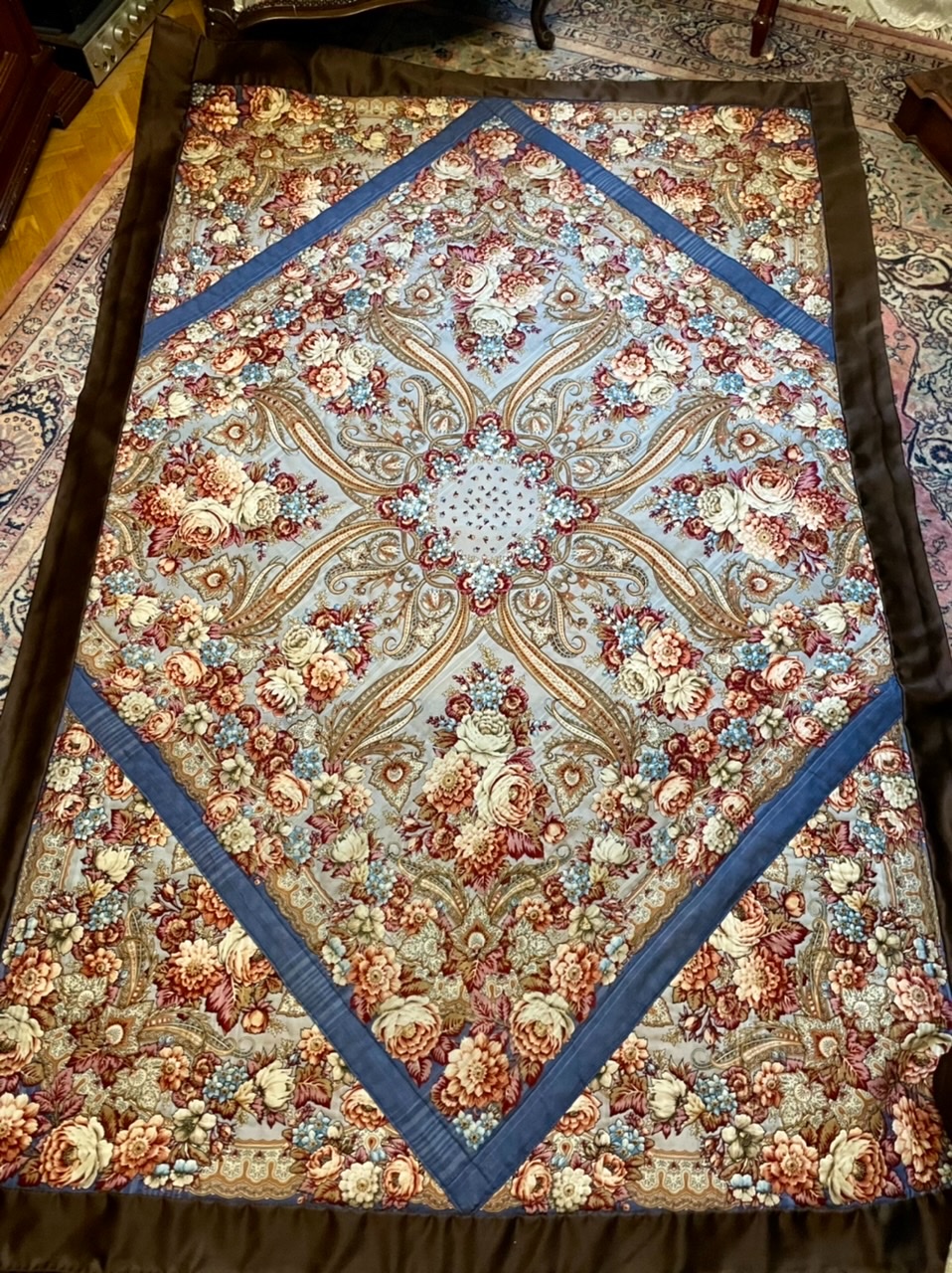 Шаль Именинница-2 превратилась в покрывало. Пару лет назад решила сотворить такую радость. Две шали были уложены на новозеландскую шерсть и вручную простёганы шелком. Обшивала каждый крупный цветок, букет и вензель. Стежки около 2 мм. Серединки у крупных цветов вышиты бронзовым бисером. Подклад и кайма из вискозы шоколадного цвета. Шёлк для простёжки выбирала в цвет каймы. Получилось очень тёплое и воздушное покрывало