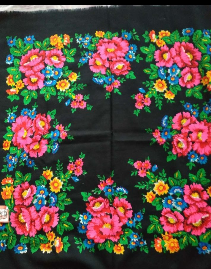 У меня есть платок ппу_52, но жёлтые и красные цветки раскрашены наоборот. ) Платок вполне квадратный, размер 95 см. Сфотографировала.
