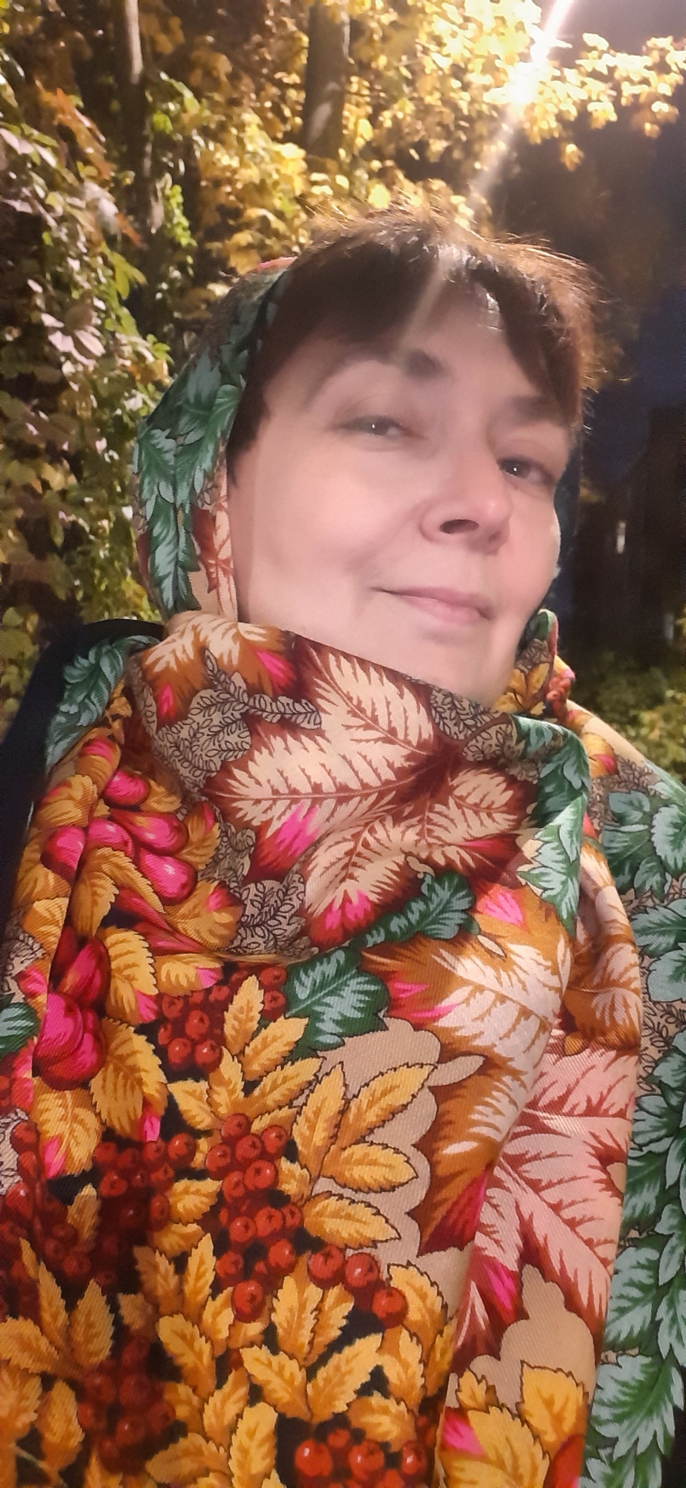 Месяц назад купила День осени златой 14 колорит. Самый яркий из всех осенних! Платок дивный! Спасибо Виктору Зубрицкому. Шаль прекрасно смотрится на голове и подходит для интерьерной драпировки. Добавляла шаль в оформление школьной фотозоны. Теперь ученики пишут декоративный натюрморт.