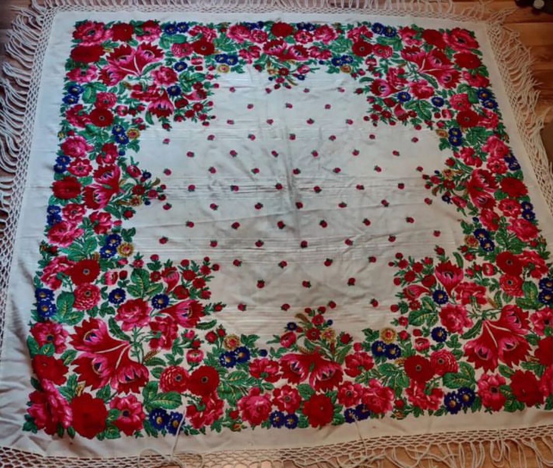 Как я понимаю, Валерия Фадеева нарисовала крок по мотивам старинной шали, доработав его, средник оставив без штампочек, чтобы Виктор Зубрицкий мог нарисовать вручную портрет Репина. Напечатали небольшую партию, и портрет скорее всего был нарисован на одном платке?