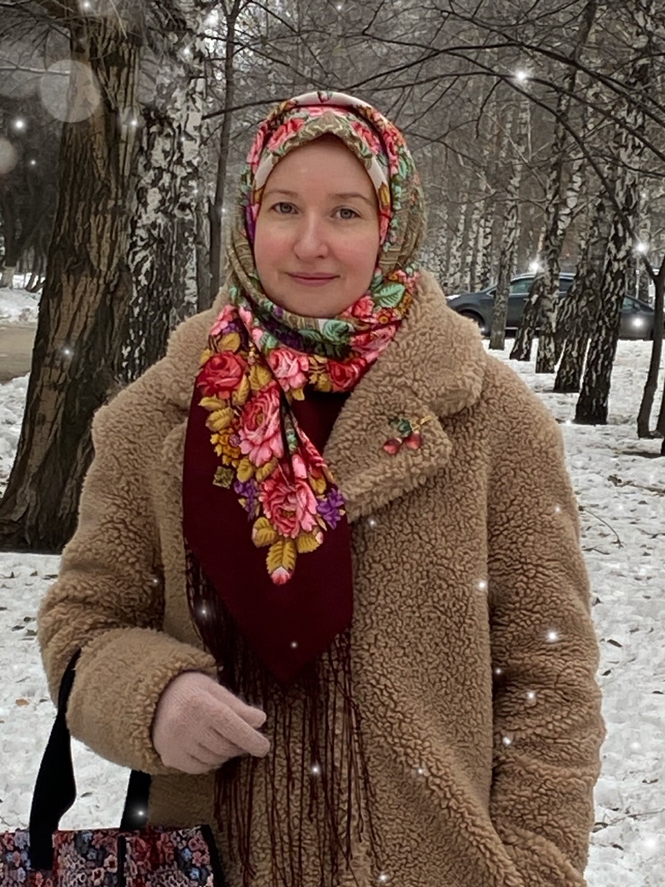 Я тоже в этом году ношу платок, как раньше носили, на лобик. ( Здесь уже съехал вверх, платок крепче держится, а шаль надо затягивать)