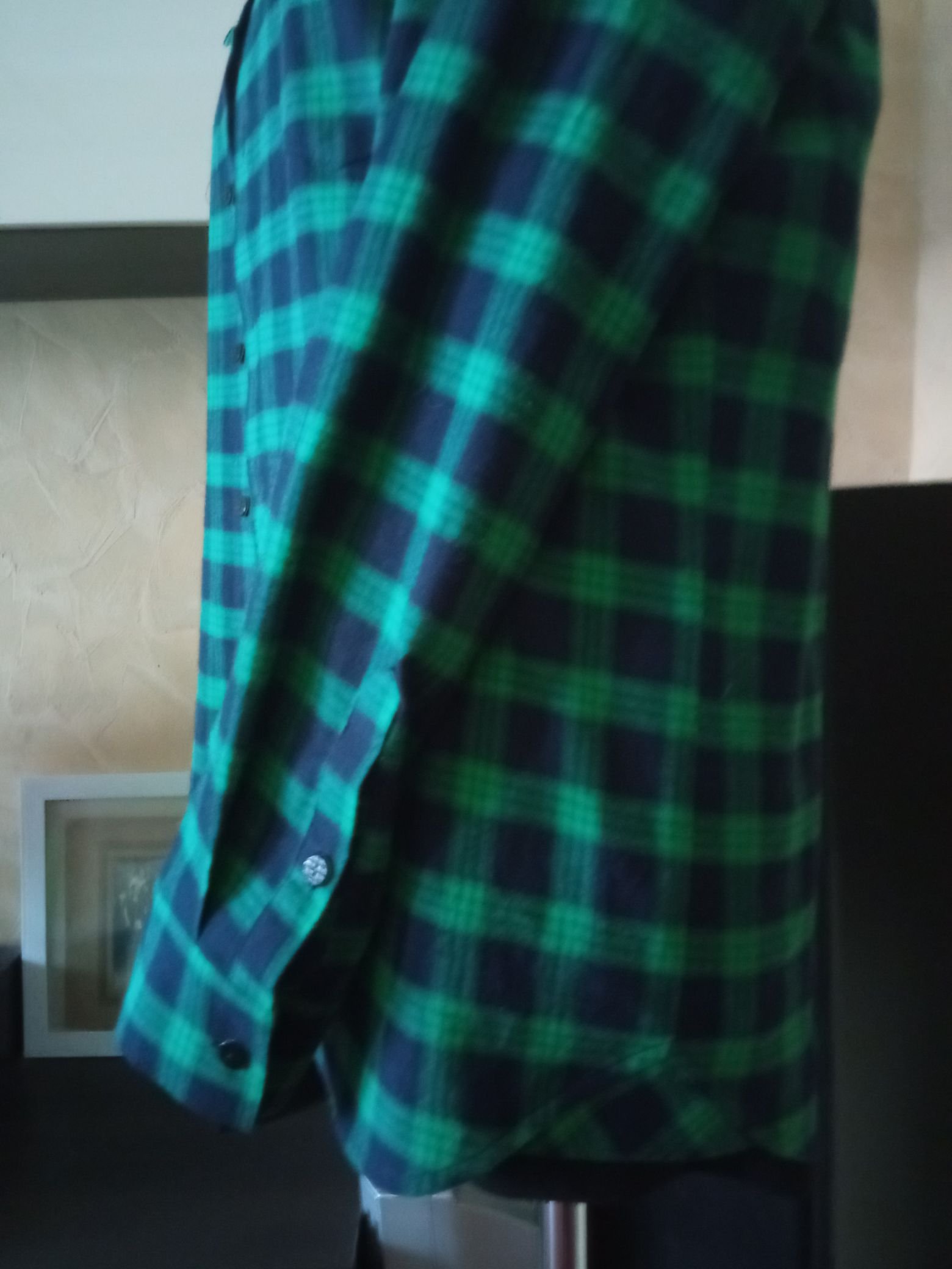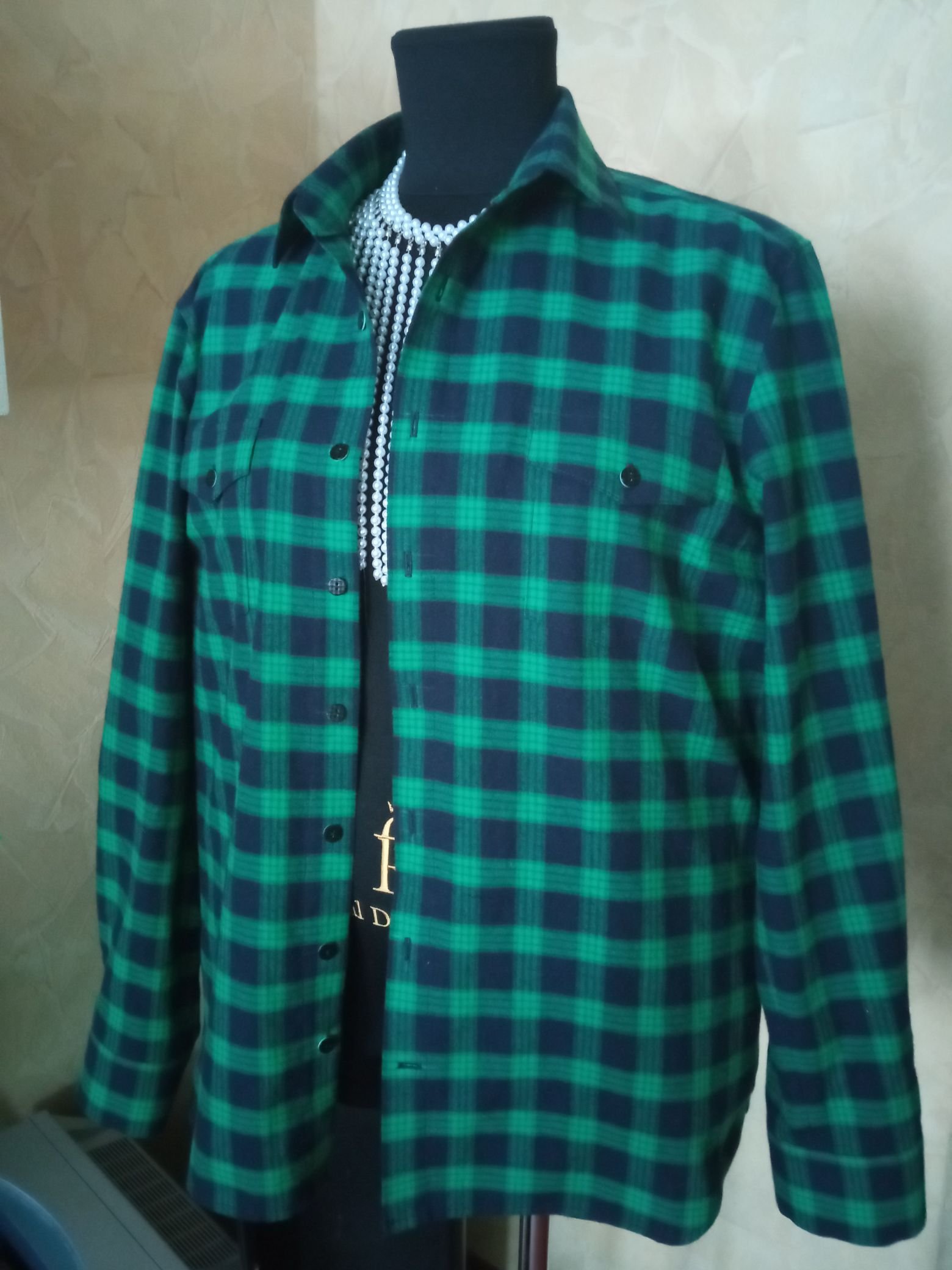 Перешла на мужской ассортимент. Шила долго и вдумчиво. Дней восемь. Только поэтому на рубашке образовались обтачки разрезов рукавов, нижняя ластовица и горизонтальная петля. Захотелось отойти от ширпотреба. (На ожерелье не смотрим, оно живет на манекене).