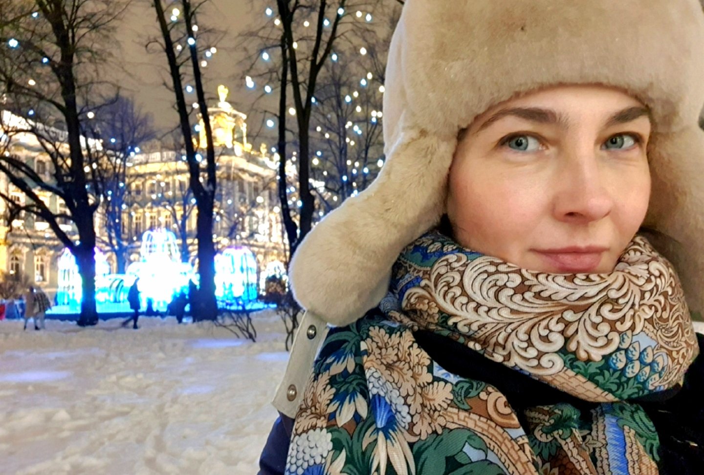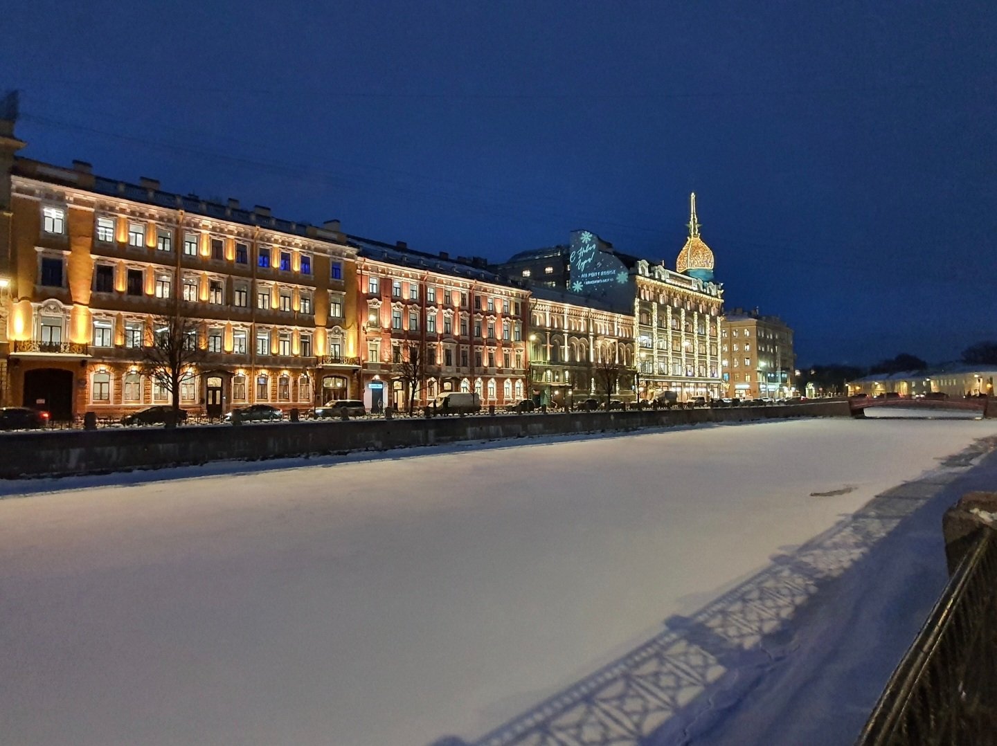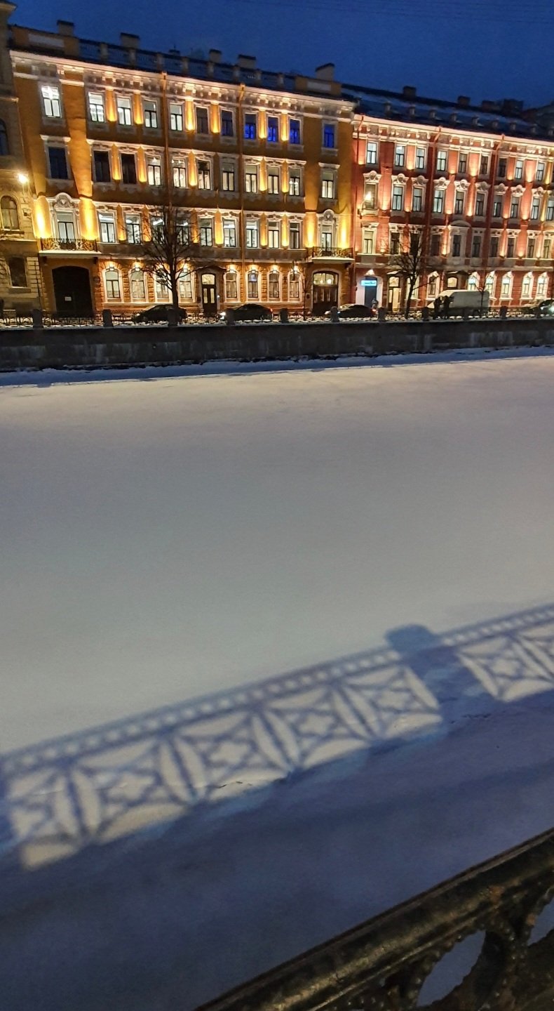 и синяя ночь в окошках, и тень ограды на замёрзшей реке, и барокко с подсветкой...