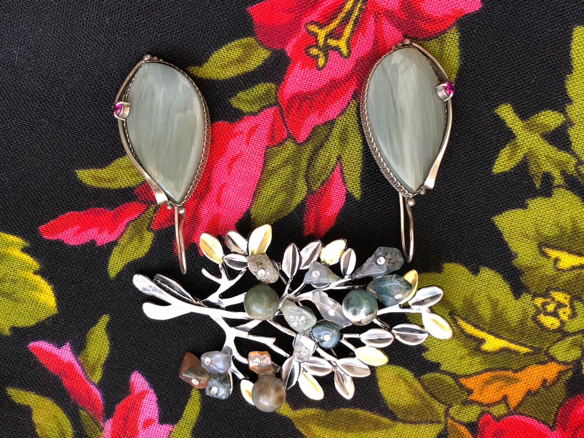 Брошь-кулон - всякие мелко-яшмочки, а серьги не помню что, неохота в блокнот лезть за названием, но маленькие - рубинчики (не корундики :lol: )
