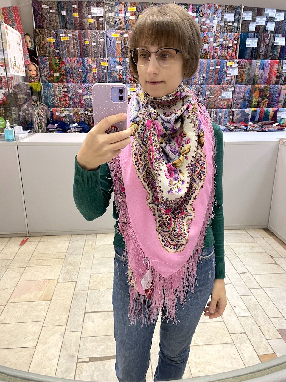 Платки на витринах висят, как известно, компактно, и кайму не видно, разве что за исключением нижнего ряда. Когда кайму мне показала продавец я только и сказала "вот это да". Руки сразу потянулись, сердце забилось чаще. Много ли розовых платков у Мануфактуры? "А много ли их у меня?" - рассуждала я во время примерки.