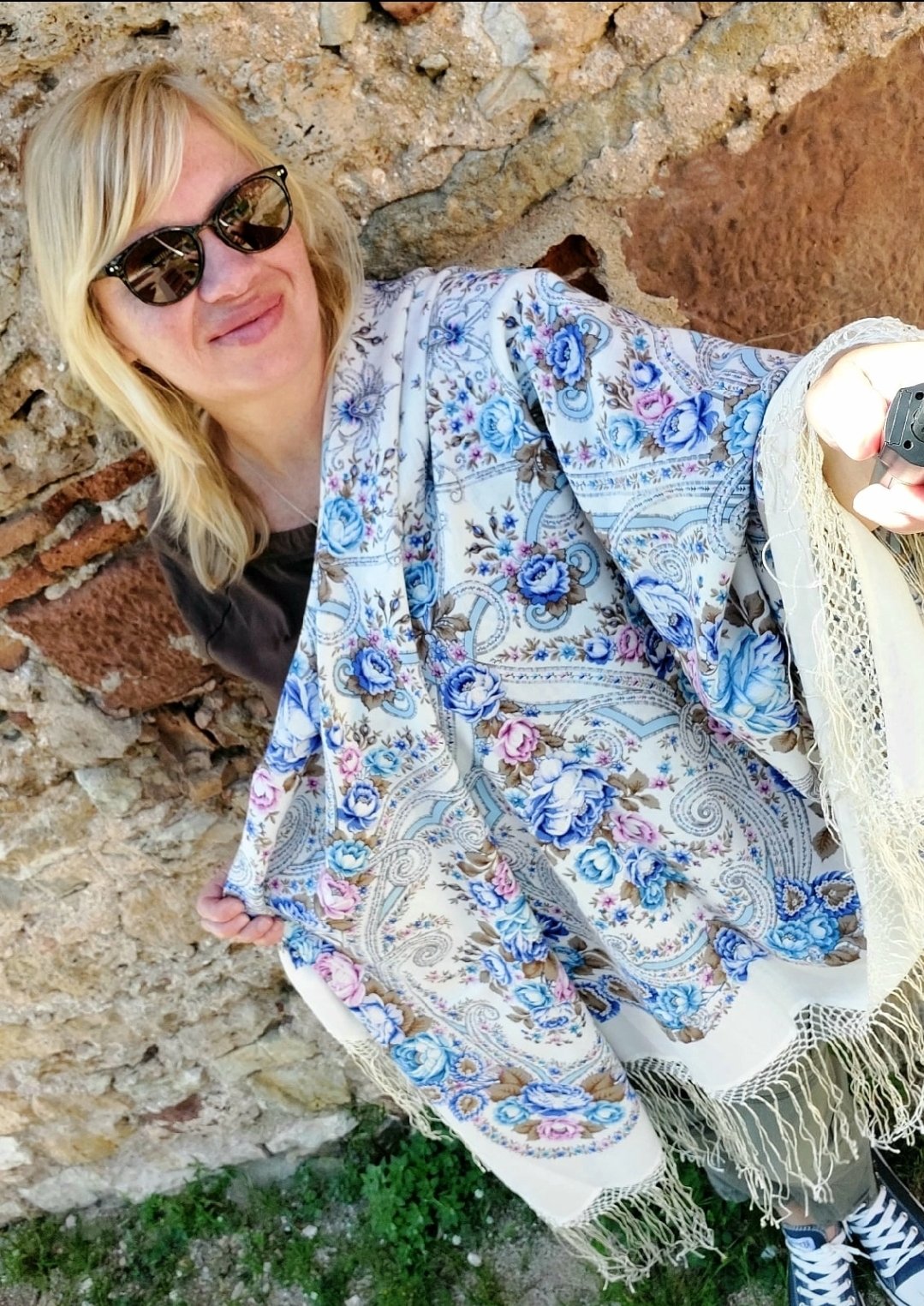 Как оказалось - шаль Подмосковье в 3 колорите имеет разные варианты печати, у меня яркой печати, Оксана в другой ветке показала Подмосковье с каймой цвета пыльной розы, очень интересный колорит, даже захотелось примерить, может в Москве есть ещё такие шали, надо поискать.