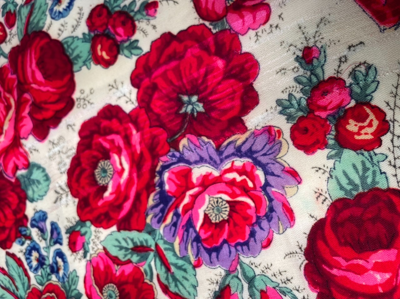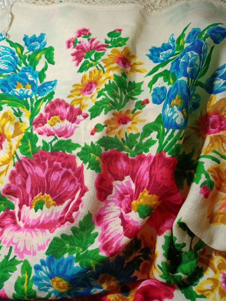 Не перестаю восхищаться прелестью ручной набойки и удивительными оттенками, которые художники выбирали при создании шали. Обязательно смотрим на изнанку и сравнение бахромы. Шаль подшита шёлком с двух сторон, две другие - производственная кайма. Зато легко можно найти долевую))), а я постараюсь придать бахроме должный вид