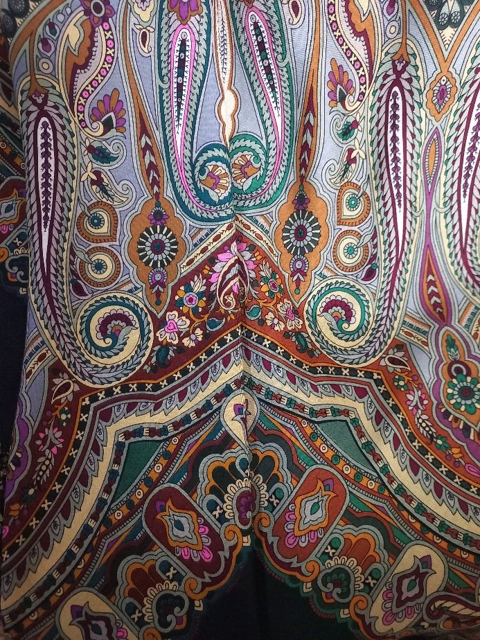 Шаль стала темнее, контрастнее. Кайма темнее. Рыжая полоса перестала быть рыжей, а стала цвета коньяка. Фиолетовые узоры стали ярче, горят игриво. Зелёная кайма стала темнее. Все эти изменения мне нравятся. Единственное жалко - широкая полоса с узором на сером фоне перестала быть "мягкой серой замшей". Узор на ней стал более четким, контрастным, ярким, более заметным, сам цвет серого немного другой и эффект мягкости замши ушел. Но, конечно, если смотреть в общем, то тот эффект замши подходил к мягкости шали прежнего выпуска, а новой шали и не нужен. Пусть он останется на прежней, где прекрасно смотрится.