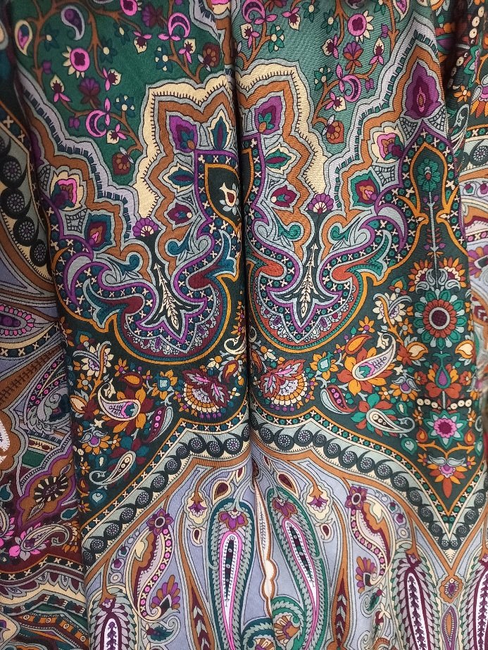 Шаль стала темнее, контрастнее. Кайма темнее. Рыжая полоса перестала быть рыжей, а стала цвета коньяка. Фиолетовые узоры стали ярче, горят игриво. Зелёная кайма стала темнее. Все эти изменения мне нравятся. Единственное жалко - широкая полоса с узором на сером фоне перестала быть "мягкой серой замшей". Узор на ней стал более четким, контрастным, ярким, более заметным, сам цвет серого немного другой и эффект мягкости замши ушел. Но, конечно, если смотреть в общем, то тот эффект замши подходил к мягкости шали прежнего выпуска, а новой шали и не нужен. Пусть он останется на прежней, где прекрасно смотрится.
