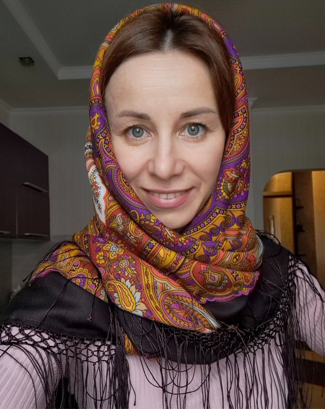 Елена М! Прекрасные платки и вам к лицу, только почему вы такая грустная?!