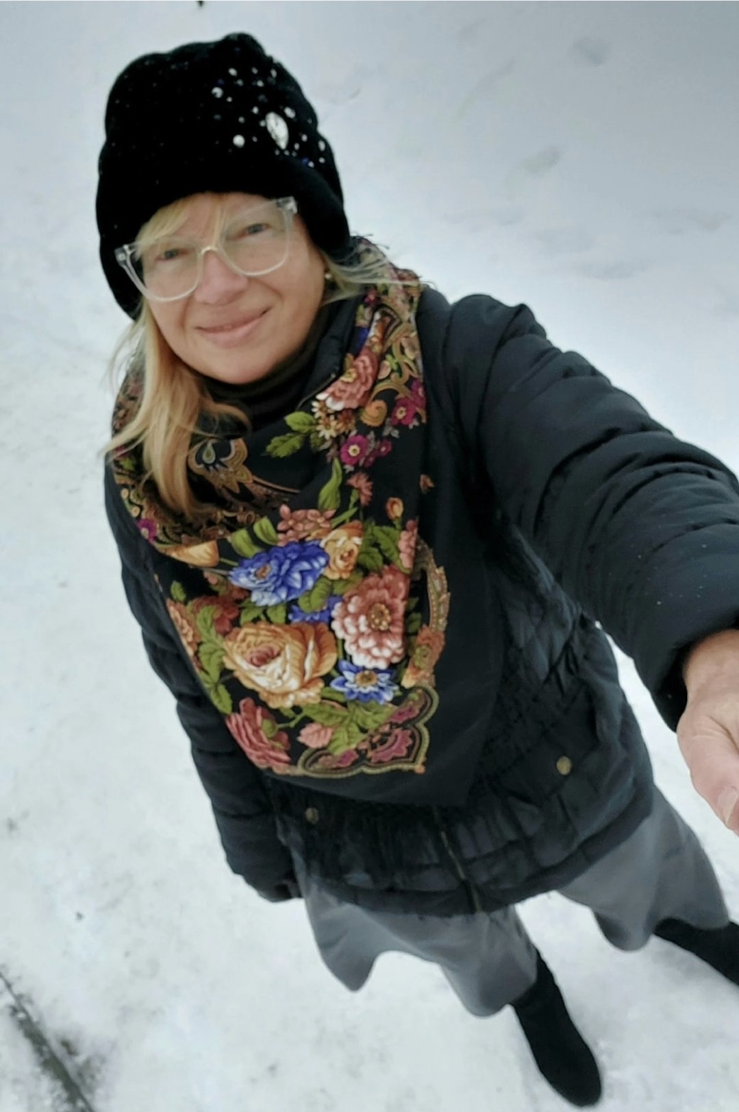 В обеих Радоницах отлично! Вы умеете носить шали модно, стильно, задорно! На фоне белого снега - красота! В синей Радонице - для меня более привлекательно, чем в чёрной.