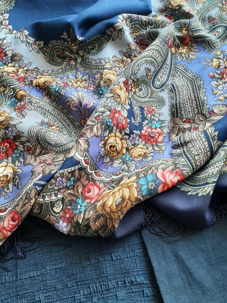 Шаль Клары Зиновьевой "Небесный" в 14 колорите. Цветопередача точная. Общая гамма сдержанная, слегка припыленная.