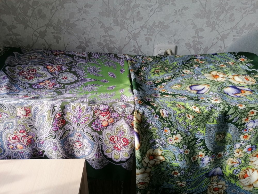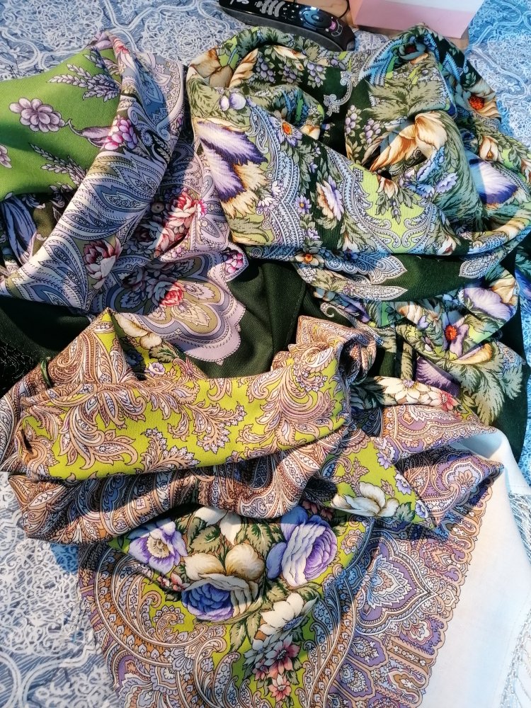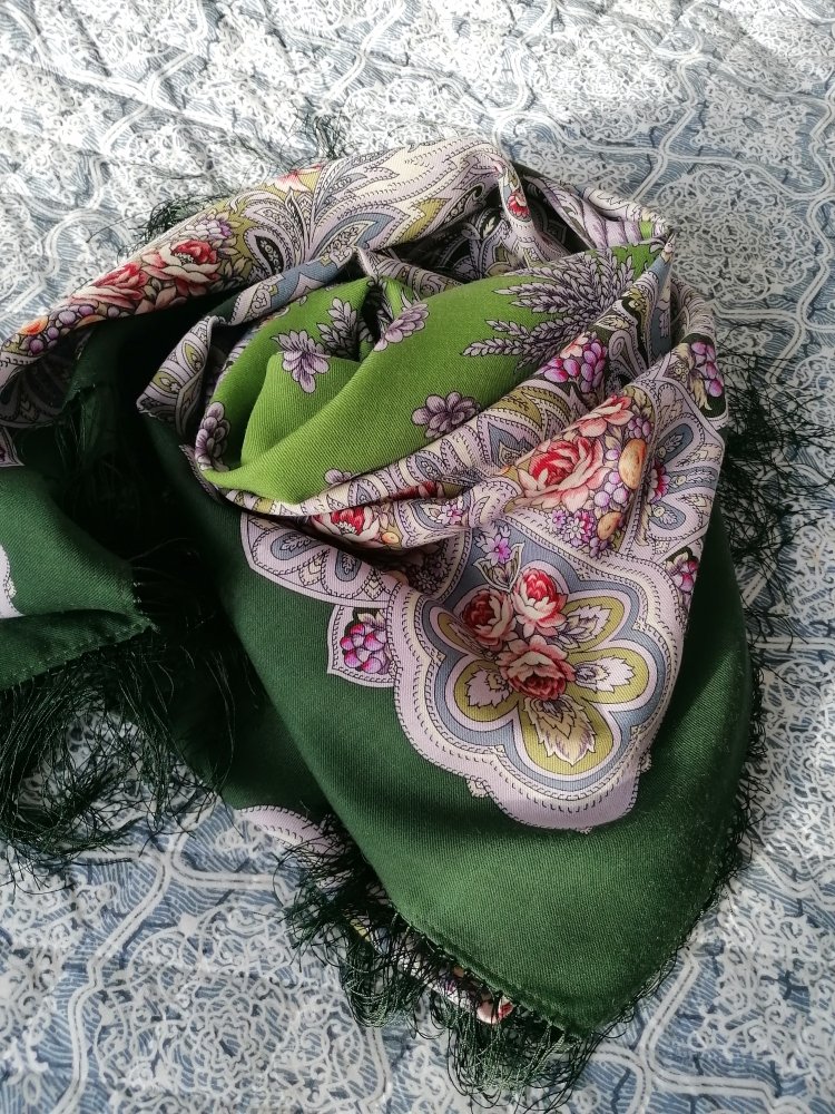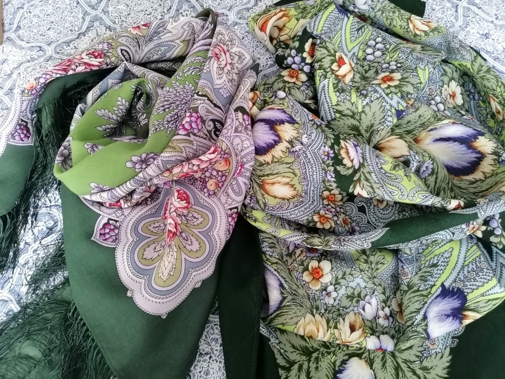 Оба платка нравятся, но совершенно не мои. Иногда правда хочется поплясать с бубном, чтобы надеть эту лесную зелень. Не хватает лимонной Чародейки Зимы в сравнении, все три одного художника. Хороши были бы комплектом