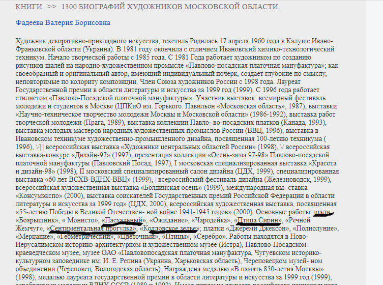 В конце статьи о художнике на сайте: "За время работы на предприятии Валерией Борисовной Фадеевой создано более 180 рисунков для павловопосадских шалей, многие из которых (курсив мой) внедрены в производство и пользуются неизменной популярностью у покупателей".