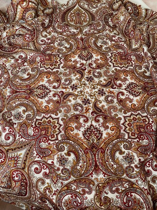 Контрастный, нежный и деликатный рисунок! Опасалась неонового, персикового-желтого. Нет --есть похожий цвет, но он больше "тыквенный сок". Очень прекрасный--красный георгин. Много прожилок с осторожным темно-розовым. Общий фон , как обычно молочно-сливочный.