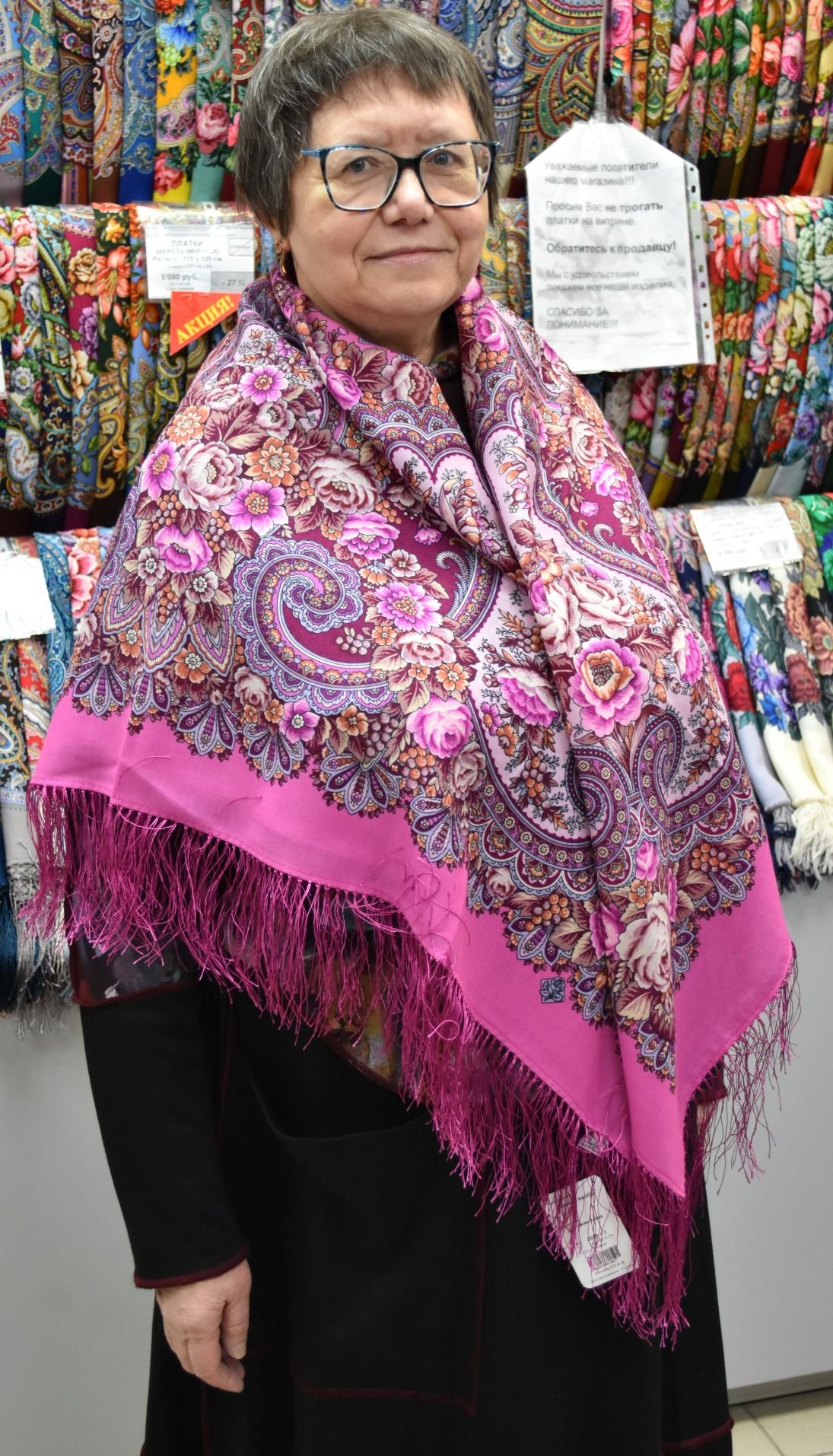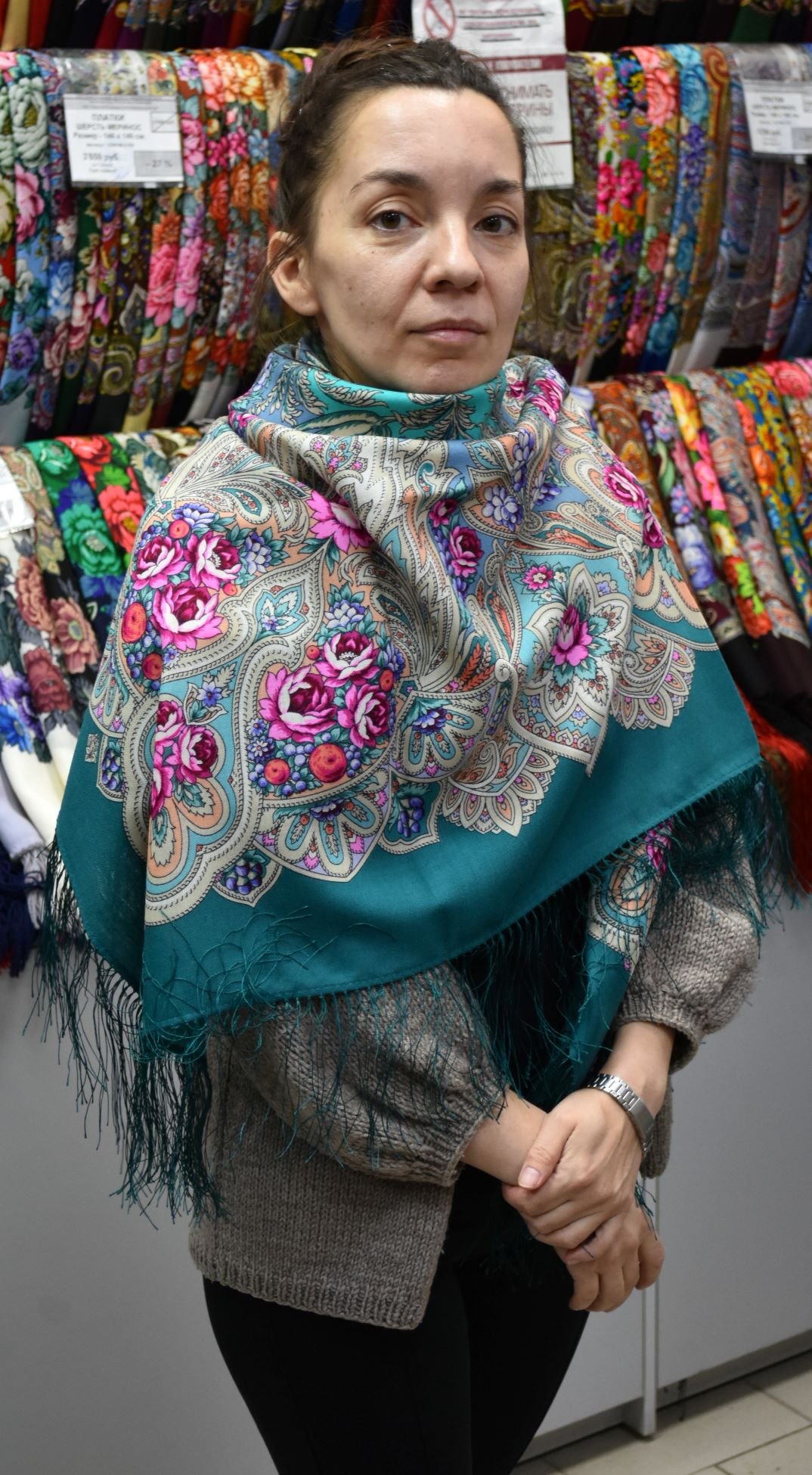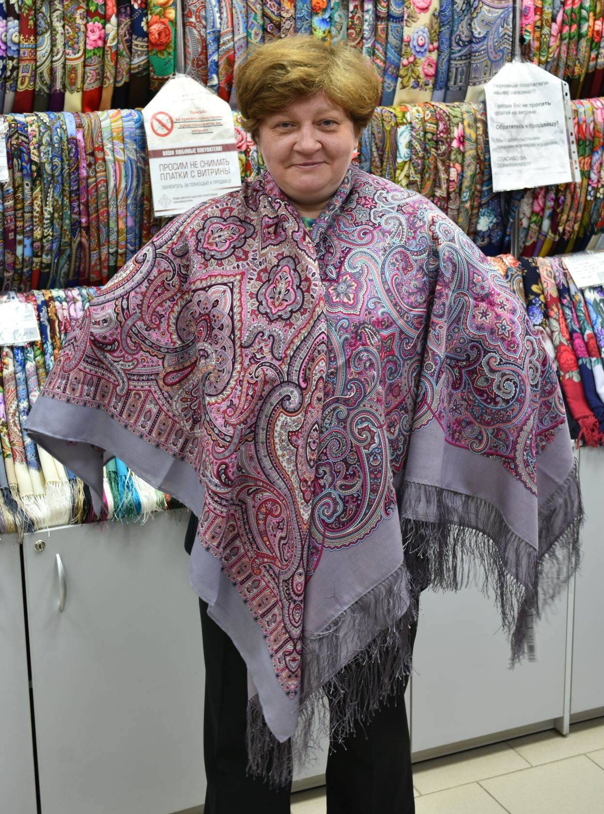 Я воспользовалась тем, что доступ к витрине с шелками освободился, прилипла к ней. Ну люблю я шелк! Примерила 3 крепдешиновых платочка. Названия у них, понятно, не фонтан, но сами платочки красивые.