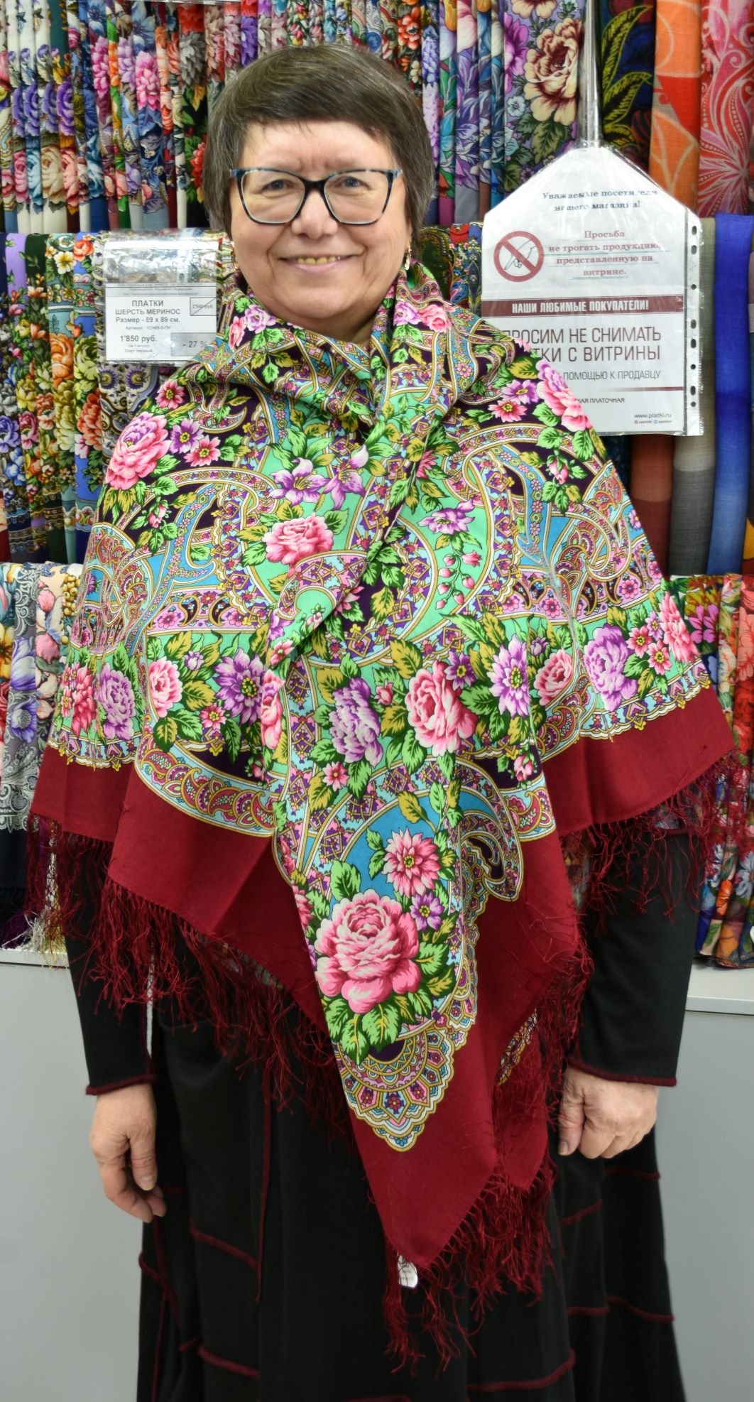 Я воспользовалась тем, что доступ к витрине с шелками освободился, прилипла к ней. Ну люблю я шелк! Примерила 3 крепдешиновых платочка. Названия у них, понятно, не фонтан, но сами платочки красивые.