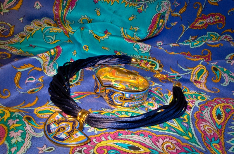 А я в последнее время возлюбила "до невозможности" шелковый платок "Промыслы Подмосковья". Правда, все время пытаюсь спрятать или завернуть эти самые "промыслы", которые в медальонах напечатаны, т.к. некоторые из них грубоваты. Но во всем остальном платочек хорош, рисунок на нем нежный, цветовая гамма очень красивая. Можно сворачивать платок разными сторонами, чтобы выпустить побольше того цвета, который нравится, а потом подбирать какие вздумается украшения. Вариантов очень много.