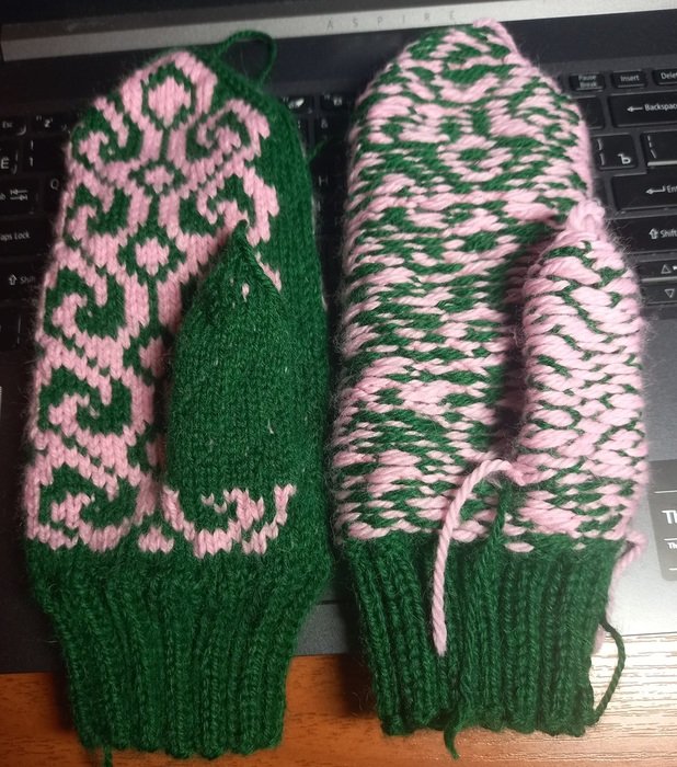 Люблю северные узоры, лешуконские, коми, мезенские, геометрические, кресты, свастики, решетки, и т.д., вот связала такие, они большие, но и рука у меня крупная, пальцы длинные, мне большие нравятся. Всю жизнь носила какие-то маленькие, короткие, куцые, наконец-то будут варежки под себя и для себя.