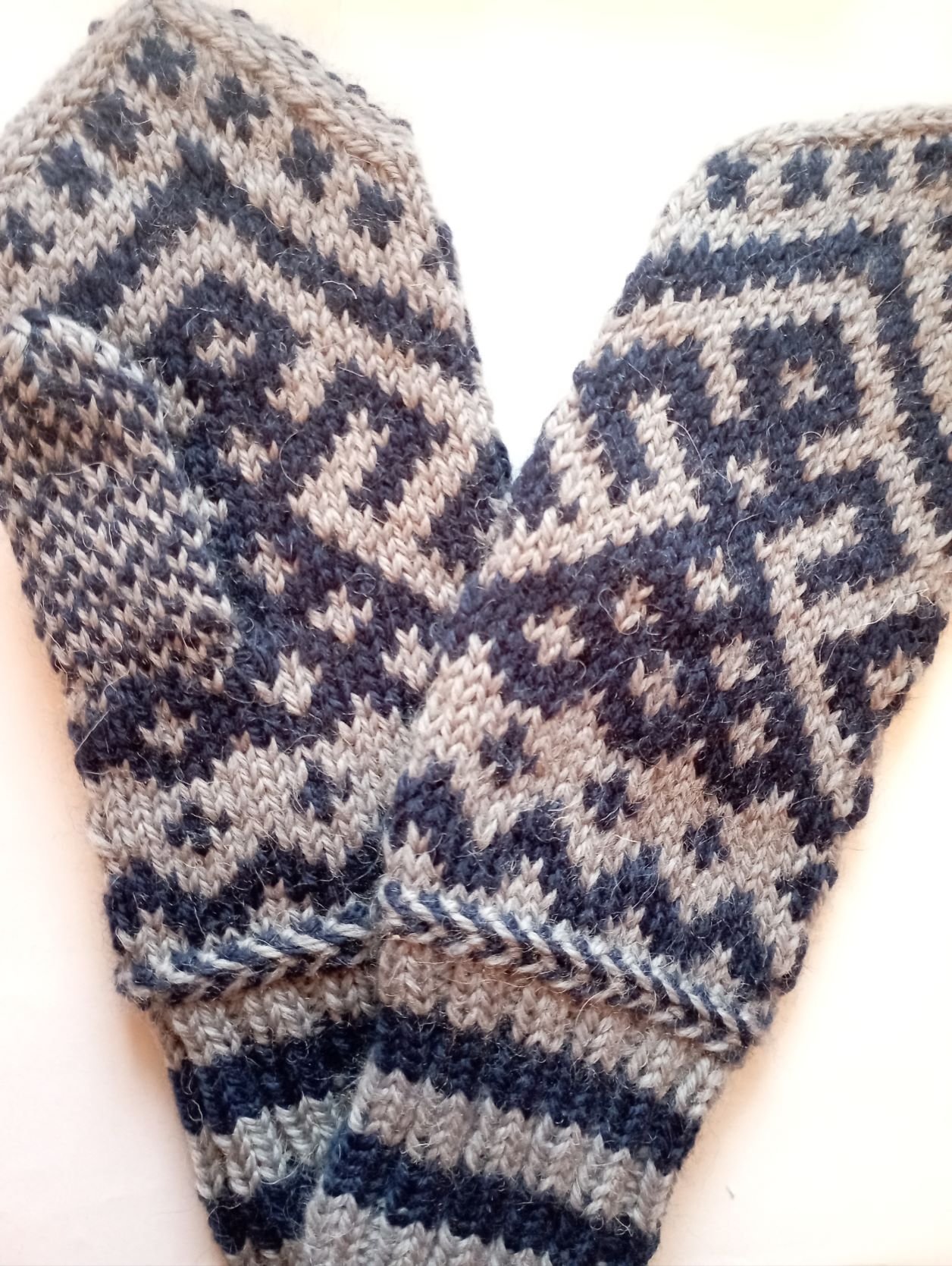 Люблю северные узоры, лешуконские, коми, мезенские, геометрические, кресты, свастики, решетки, и т.д., вот связала такие, они большие, но и рука у меня крупная, пальцы длинные, мне большие нравятся. Всю жизнь носила какие-то маленькие, короткие, куцые, наконец-то будут варежки под себя и для себя.