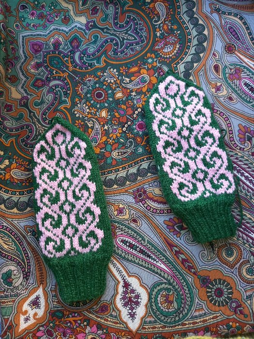 Люблю северные узоры, лешуконские, коми, мезенские, геометрические, кресты, свастики, решетки, и т.д., вот связала такие, они большие, но и рука у меня крупная, пальцы длинные, мне большие нравятся. Всю жизнь носила какие-то маленькие, короткие, куцые, наконец-то будут варежки под себя и для себя.