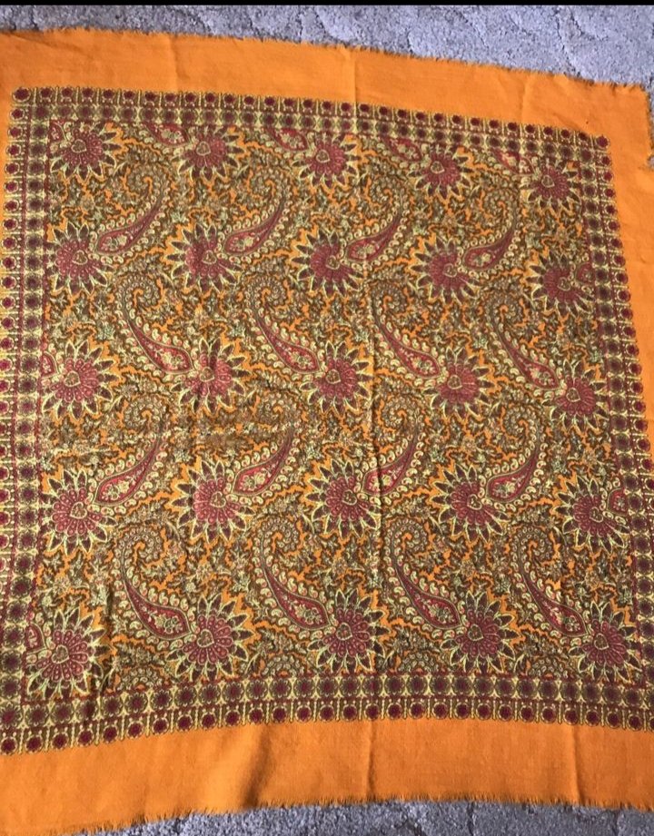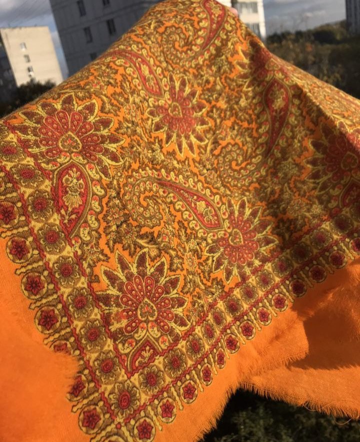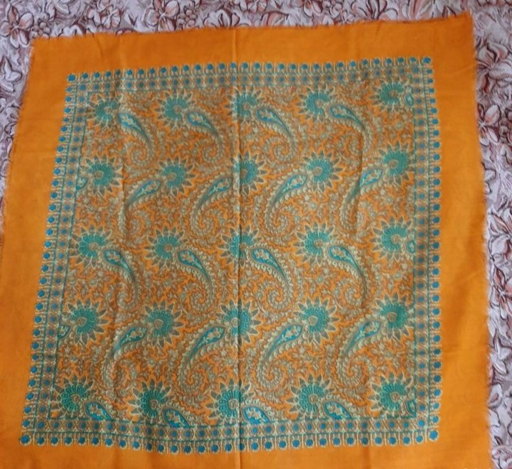 Показываю мой платочек ппх_23, такого колорита пока нет в коллекции. Надо сказать, что ранее указывали другой размер, а мой - маленький, 70 на 72 см.