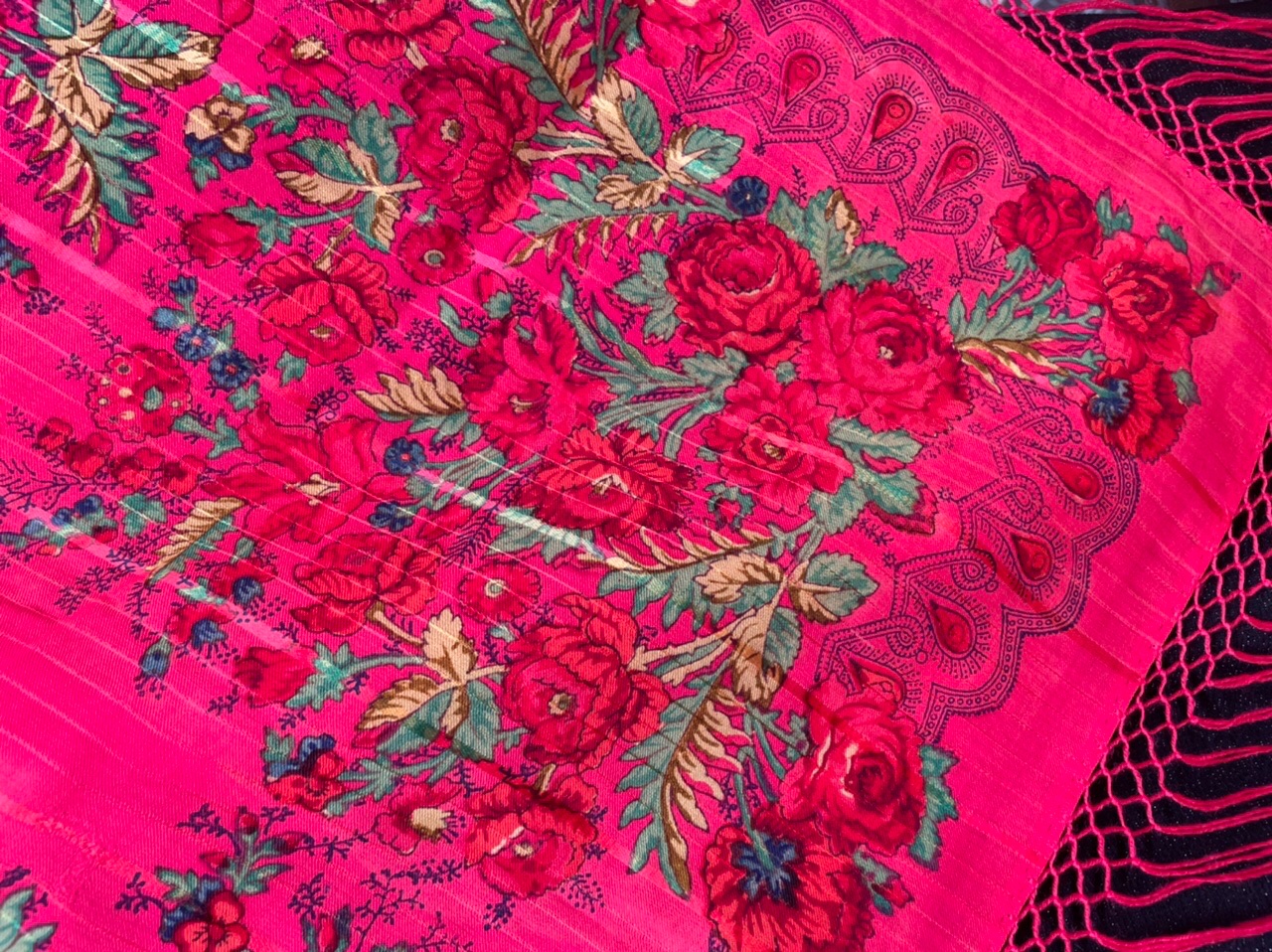Гораздо перспективнее ориентироваться на технологические моменты - ткань полотна, подгибка, даже бахрома. Неслучайно Ковалева возлагает надежды на химический анализ платков (особенности сырья, красителей). Именно когда я это услышала - возрадовалась. Может быть, удастся раскидать безымянные дореволюционные платки хотя бы по фабрикам.