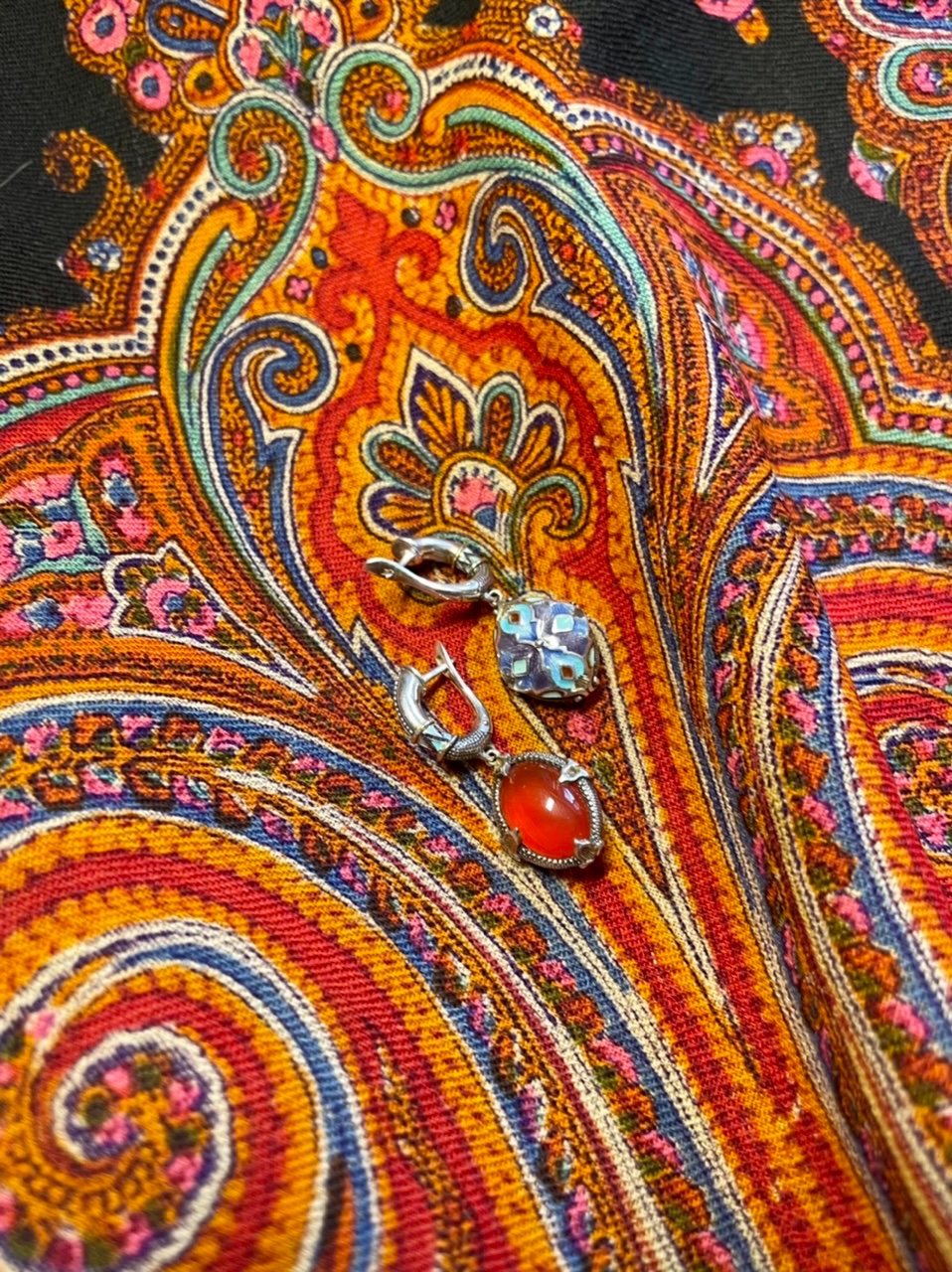 И без любования никуда: хранить такие шали надо в шкатулках(придётся обзавестись) и сразу же изумительно подобрались серьги с сердоликом (карнеолом) и эмалью