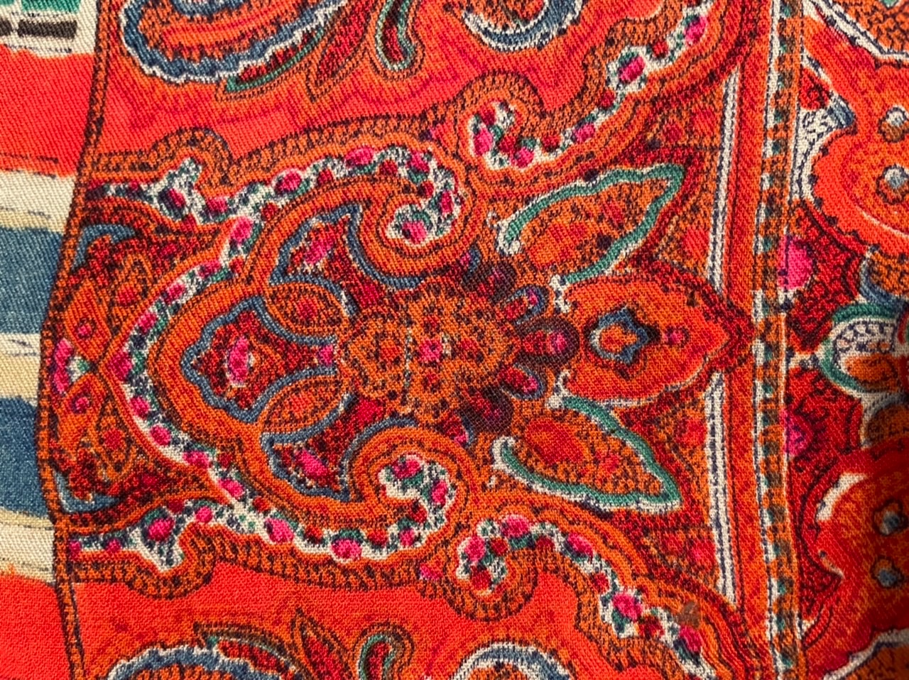 Старинная шаль, тонкая шерсть, ручная набойка, 168х170. Полосатая кайма 5 см. Клеймо.