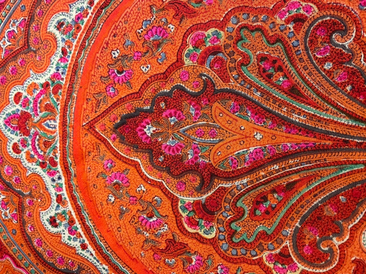 Пока ждала эту шаль, пересмотрела огромное количество материалов по орнаментальным шалям, но не нашла похожую. Стало уже казаться, что я не вижу чего-то явного. А сегодня открыла и поразилась красотой рисунка. Но самое интересное - клеймо. Его сразу и не заметишь, такое оно маленькое. Читается плохо. Рядом цифровой штамп «10» или «101». Диаметр 2 см. Есть внутренняя рамка в клейме и там тоже что-то написано. Таких маленьких клейм не так уж и много.