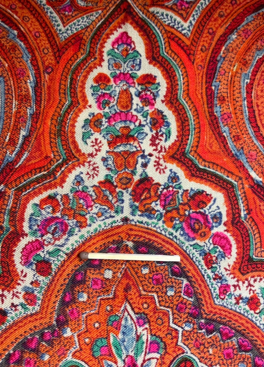 Старинная шаль, тонкая шерсть, ручная набойка, 168х170. Полосатая кайма 5 см. Клеймо.