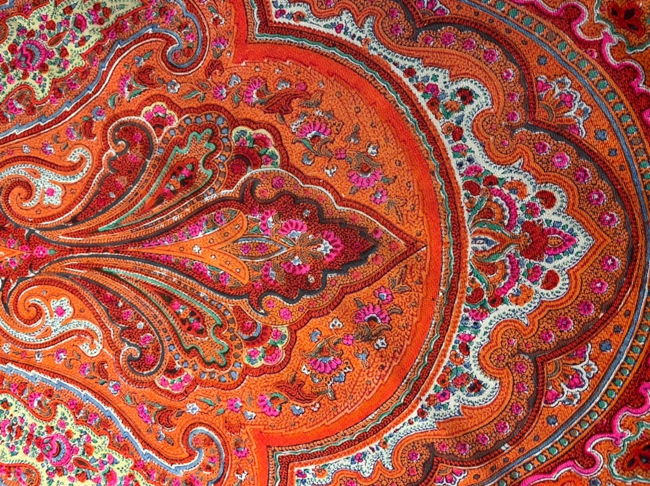 Пока ждала эту шаль, пересмотрела огромное количество материалов по орнаментальным шалям, но не нашла похожую. Стало уже казаться, что я не вижу чего-то явного. А сегодня открыла и поразилась красотой рисунка. Но самое интересное - клеймо. Его сразу и не заметишь, такое оно маленькое. Читается плохо. Рядом цифровой штамп «10» или «101». Диаметр 2 см. Есть внутренняя рамка в клейме и там тоже что-то написано. Таких маленьких клейм не так уж и много.