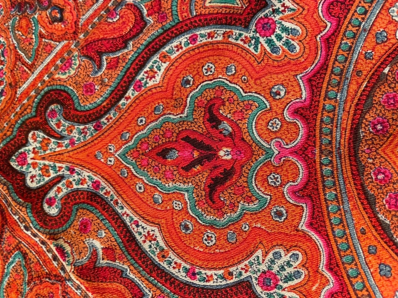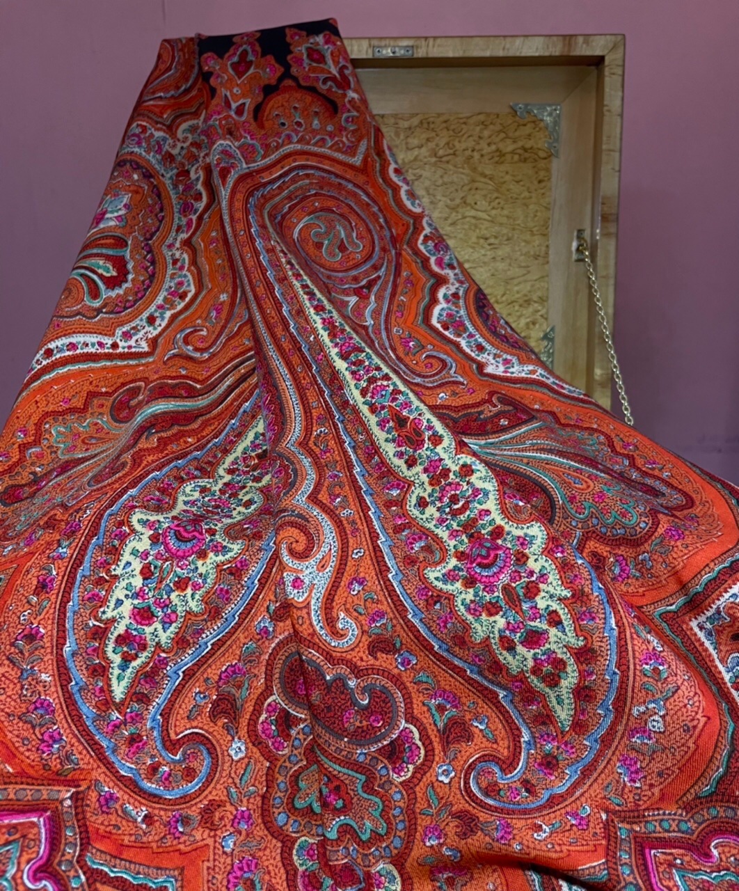 Вызывает бесконечное уважение то, как Татьяна Сухаревская работает по восстановлению старинных шалей. Даже при том, что упрощаются некоторые детали, основная канва рисунка точно передаётся, а ключевые фрагменты остаются без изменений. Я вела поиски по такой выразительной детали, как резной лист, но даже не вспомнила про хлопок. Его сохранили, хотя и с незначительными изменениями.