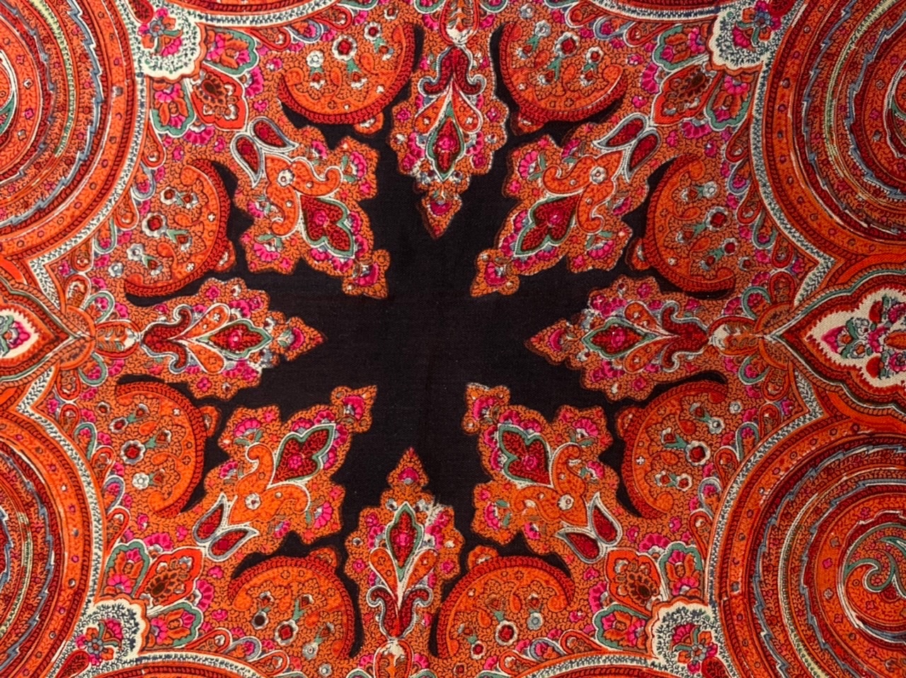 Шаль оранжево-красная, рисунок состоит из четырёх крупных опахал, обрамлённых фестончатым орнаментом. Все элементы содержат цветочные гирлянды из мелких цветов. Средник представляет из себя чёрную восьмиконечную звезду. Обрамляет рисунок орнаментальная кайма из сложных элементов.