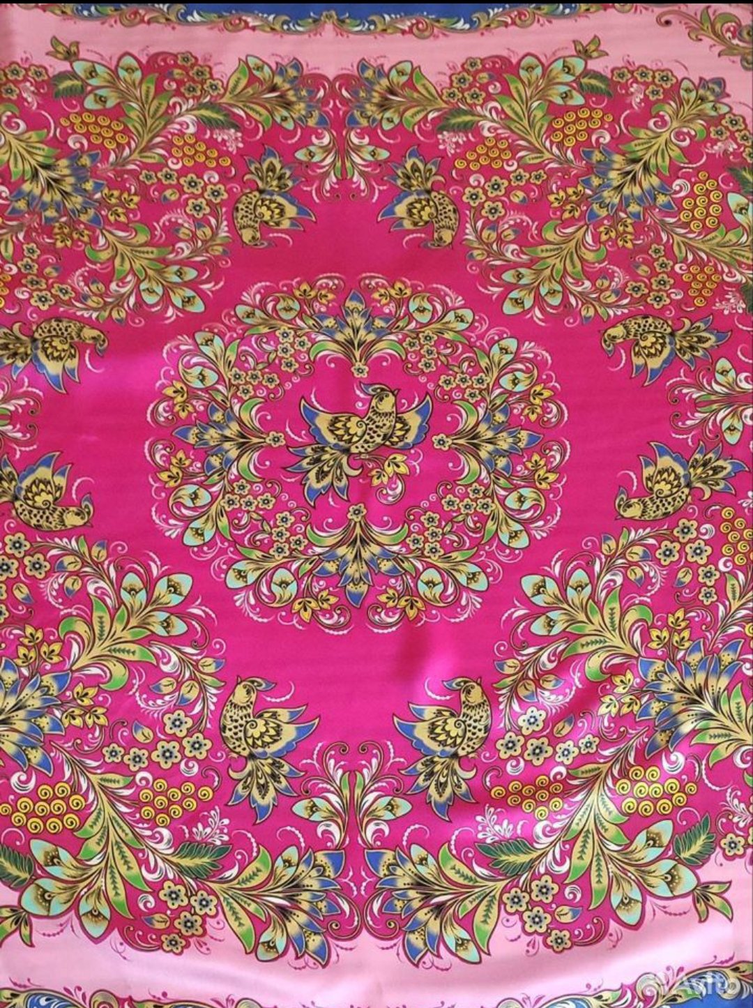 На сайтах Хохломы представлены шёлковые платки 89 см в деревянных шкатулках. Предполагаю, что розовый платок с птицей из их ассортимента.